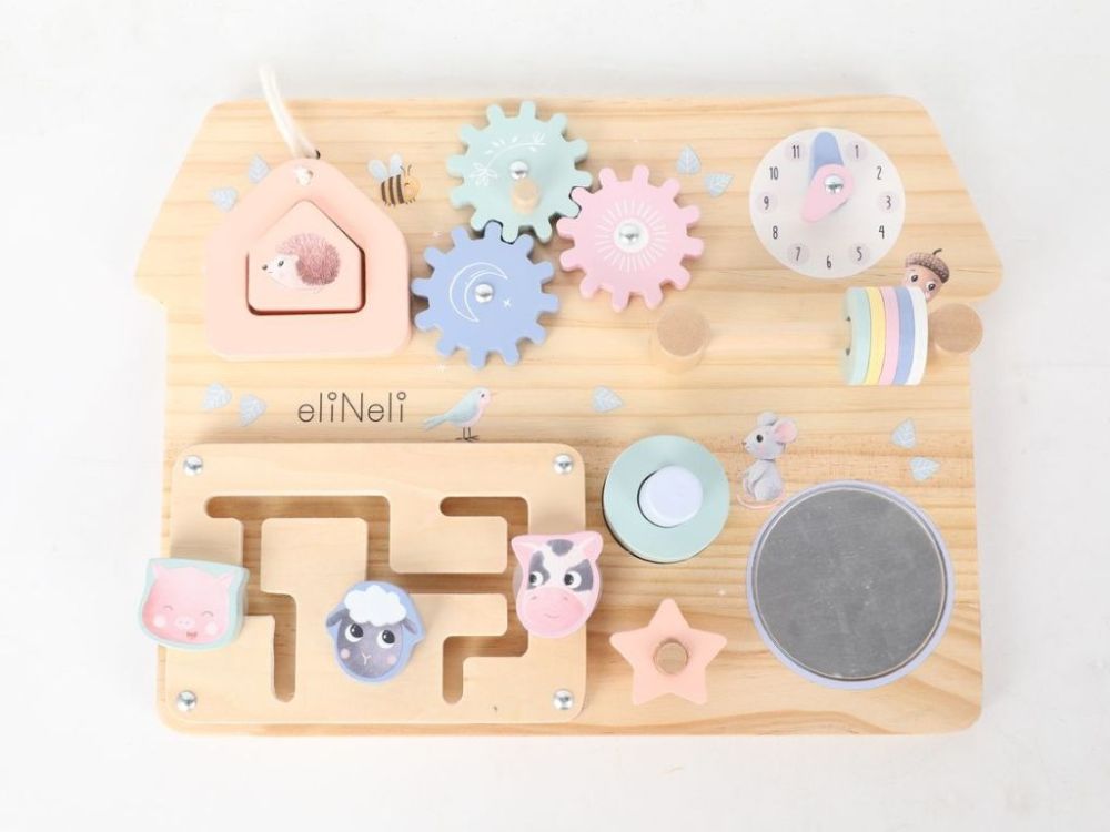 Das Activity Board enthält verschiedene pädagogische Elemente, die Kindern helfen, ihre Kreativität zu entwickeln und neue Dinge zu lernen. Die Kinder können Farben, Formen und andere grundlegende Fähigkeiten erlernen.