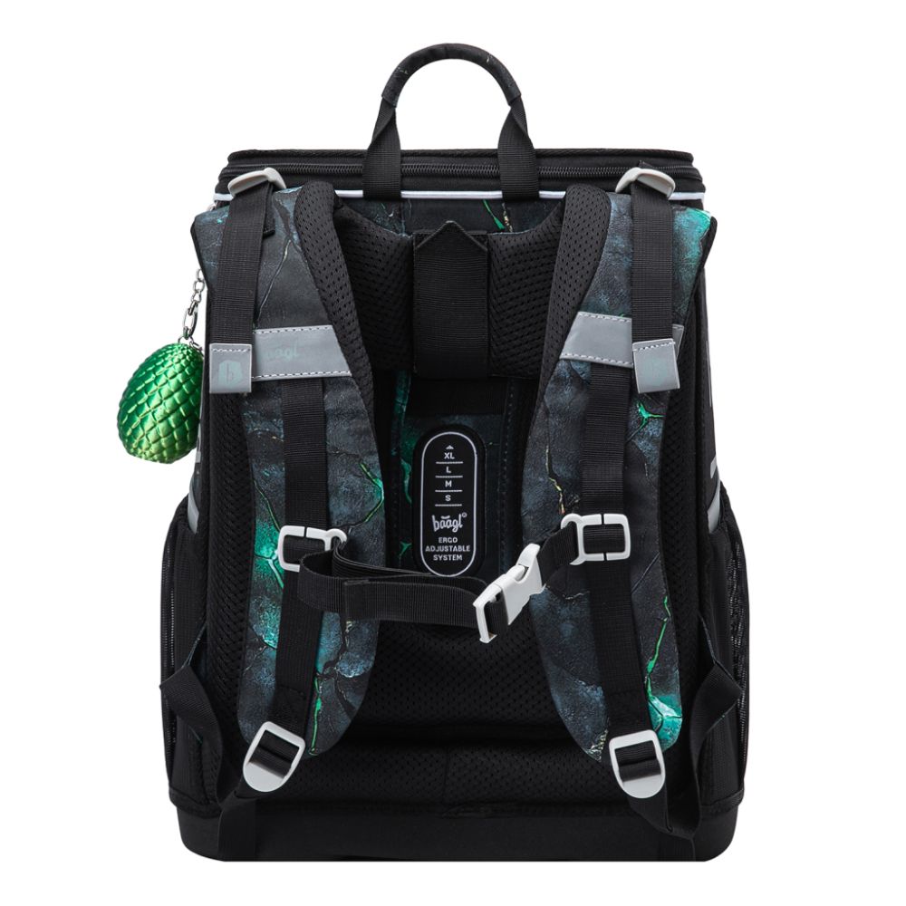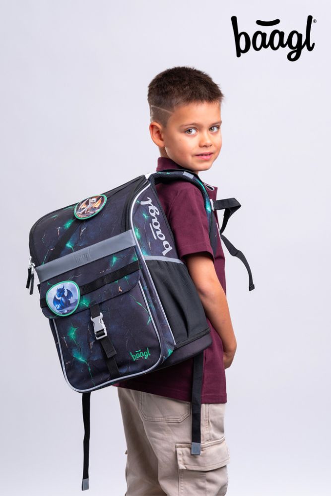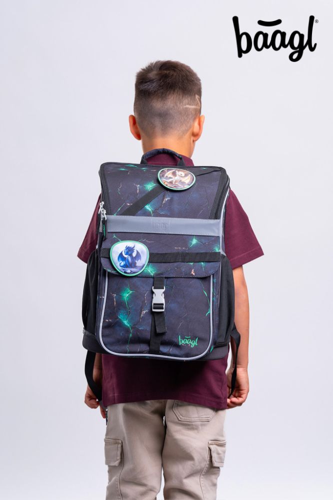Zum Set gehören ein klassisches Schulmäppchen mit zwei Klappen, das sich mit einem hochwertigen Reißverschluss verschließen lässt, ein Turnbeutel für Schuhe oder andere Freizeitaktivitäten, eine praktische Schürze für den Kunstunterricht und eine Geldbörse.