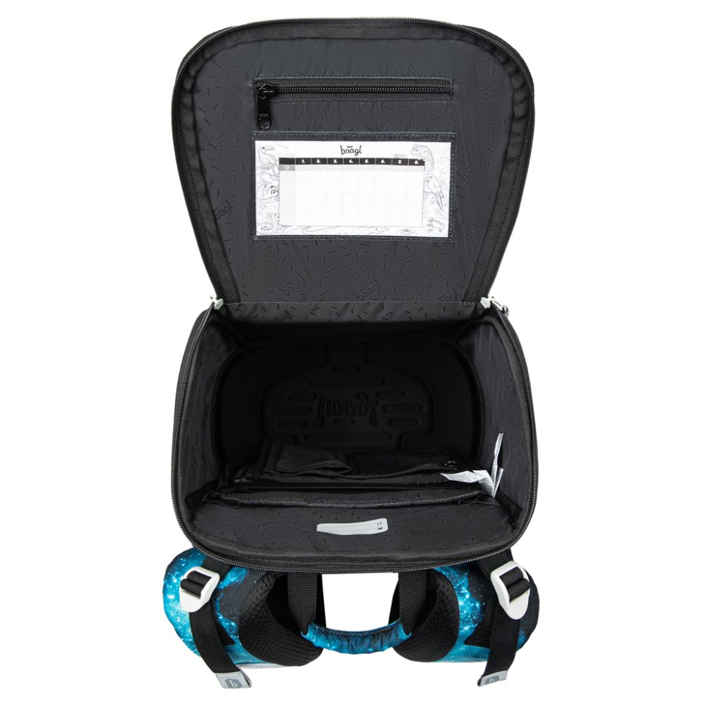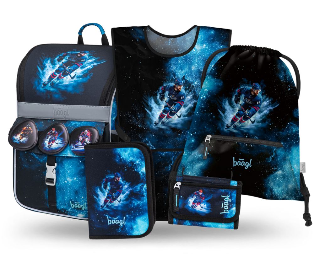 Das Set umfasst ein klassisches Schulmäppchen mit zwei Klappen, das sich mit einem hochwertigen Reißverschluss schließen lässt, eines Turnbeutel auch für andere Freizeitaktivitäten, eine praktische Schürze für den Kunstunterricht und ein Portemonnaie.
