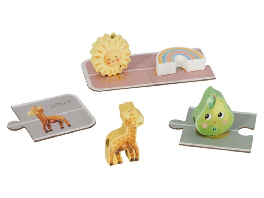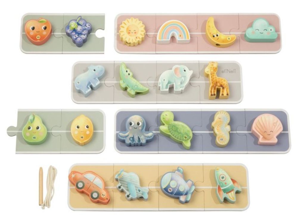 | Inhalt der Packung | Eimer, 20 Holzschnüre mit Motiven von Tieren, Früchten, Fahrzeugen und Himmelsobjekten, 20 Puzzle-Spielkarten, Schnur zum Auffädeln |