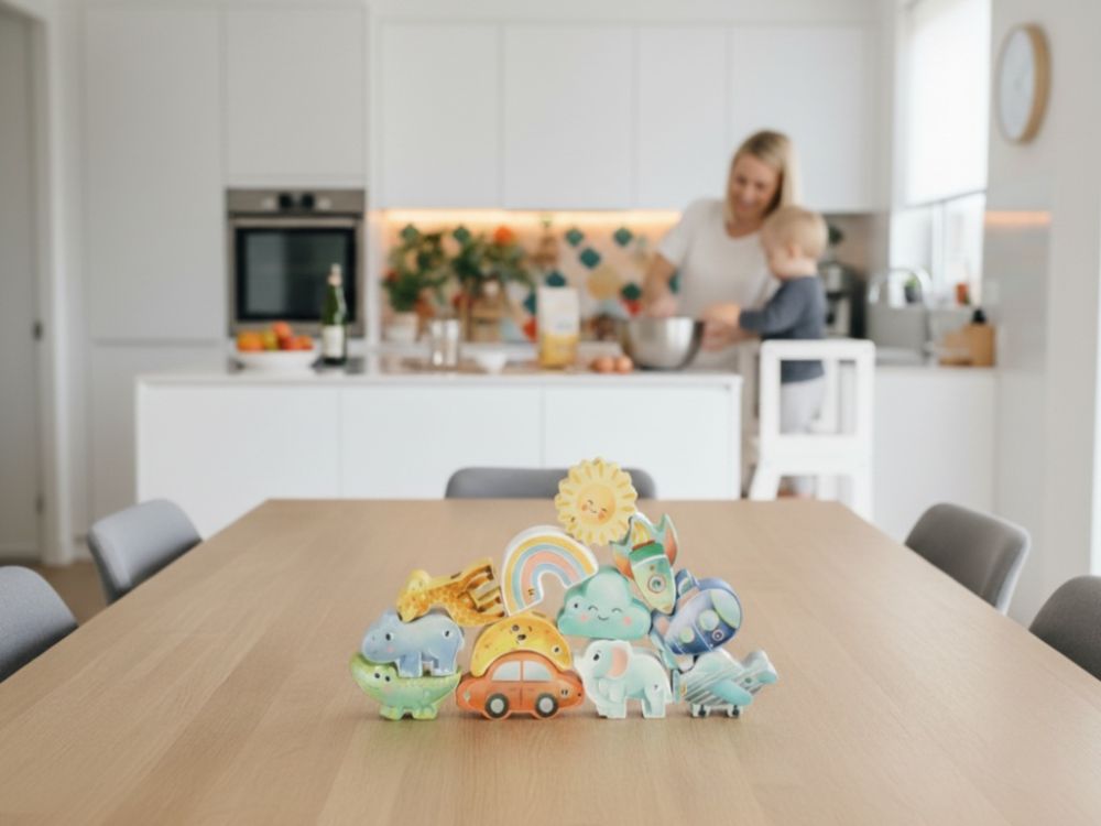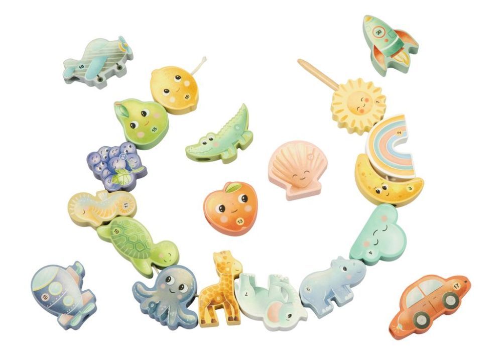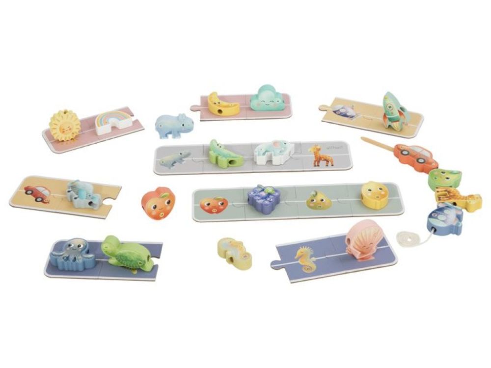 Die Spielsteine können allein durch Tasten erkannt oder mithilfe der beiliegenden Karten zugeordnet werden. Zusätzlich lassen sich die Elemente auf Schnüre auffädeln, was den Spielspaß erweitert und die motorischen Fähigkeiten weiter stärkt. Ob Tiere aus dem Zoo, Meerestiere, Fahrzeuge, Früchte oder Himmelsobjekte – die vielfältigen Motive regen Fantasie und Kreativität an.