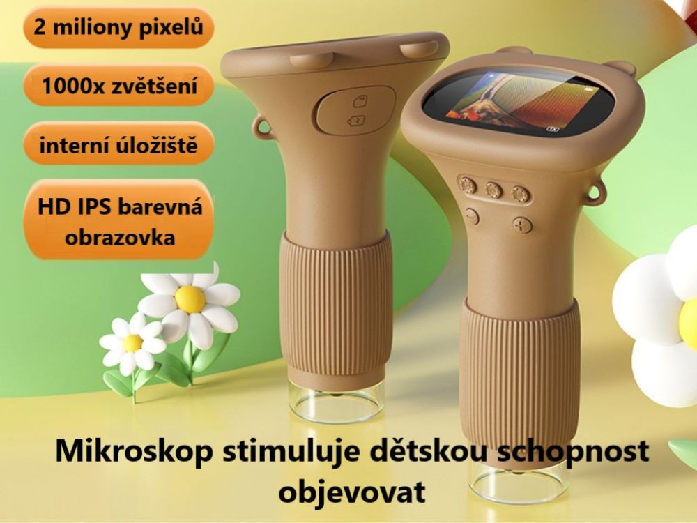 Mit dem braunen Digitalmikroskop können Kinder Objekte mit bis zu 1000-facher Vergrößerung erforschen und Details, die mit bloßem Auge nicht sichtbar sind, in Echtzeit auf einem angeschlossenen Display betrachten.