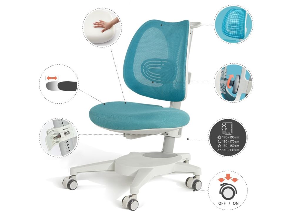 Der ergonomische Kinderstuhl passt sich perfekt der Körperform Ihres Kindes an und bietet Komfort, Bequemlichkeit und eine gesunde Rückenunterstützung. Dank der höhenverstellbaren Sitzfläche, Rückenlehne und Sitztiefe ist der Stuhl für Kinder von 3 bis ca. 18 Jahren geeignet. Die atmungsaktive Netzrückenlehne bietet eine stabile Unterstützung für den gesamten Rücken und verfügt über eine einzigartige verstellbare Lendenwirbelstütze. Das Sitzkissen mit seiner hochwertigen und stabilen Polsterung verformt sich auch nach langem Sitzen nicht , der Bezug ist atmungsaktiv und langlebig. Zum Stuhl gehört auch ein Ersatzbezug, den Sie leicht waschen können. Wenn Sie den Originalbezug (der nicht abnehmbar ist) schützen wollen, empfehlen wir Ihnen, von Anfang an den Ersatzbezug zu verwenden - wenn er schmutzig wird, ziehen Sie ihn einfach ab, waschen ihn und ziehen ihn wieder an. Das solide Untergestell ist sehr stabil und fällt nicht so leicht um. Die feststellbaren Rollen ermöglichen oder verhindern die Bewegung des Stuhls, sind für weiche und harte Oberflächen geeignet, schonend, verursachen keine Kratzer auf dem Boden. Hochwertige Materialien und Design garantieren Stärke, Stabilität und lange Lebensdauer.