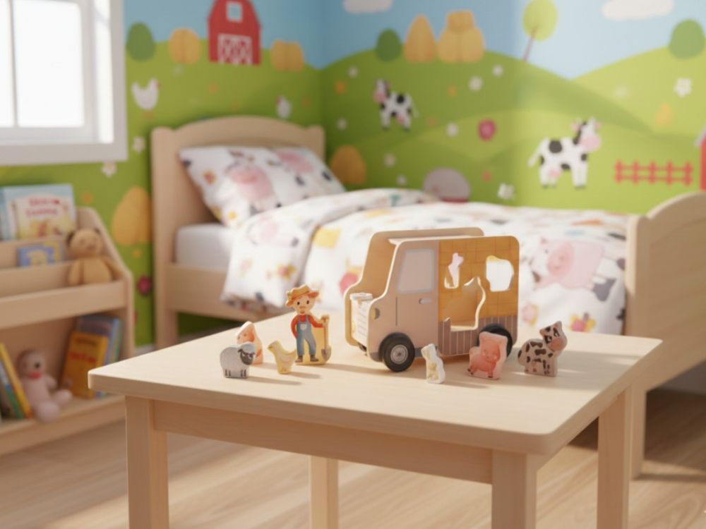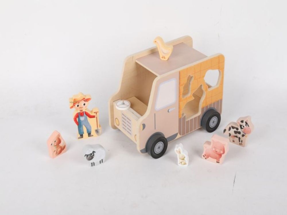 Das Auto ist auch ein originelles Puzzle, bei dem die Kinder anstelle der klassischen geometrischen Formen Bauernhoftiere in die vorbereiteten Löcher stecken .