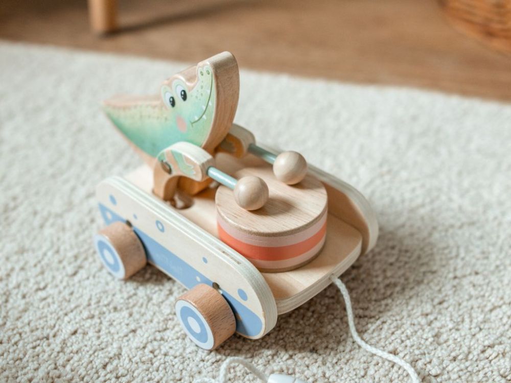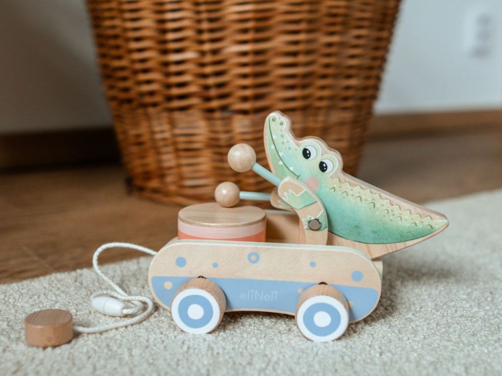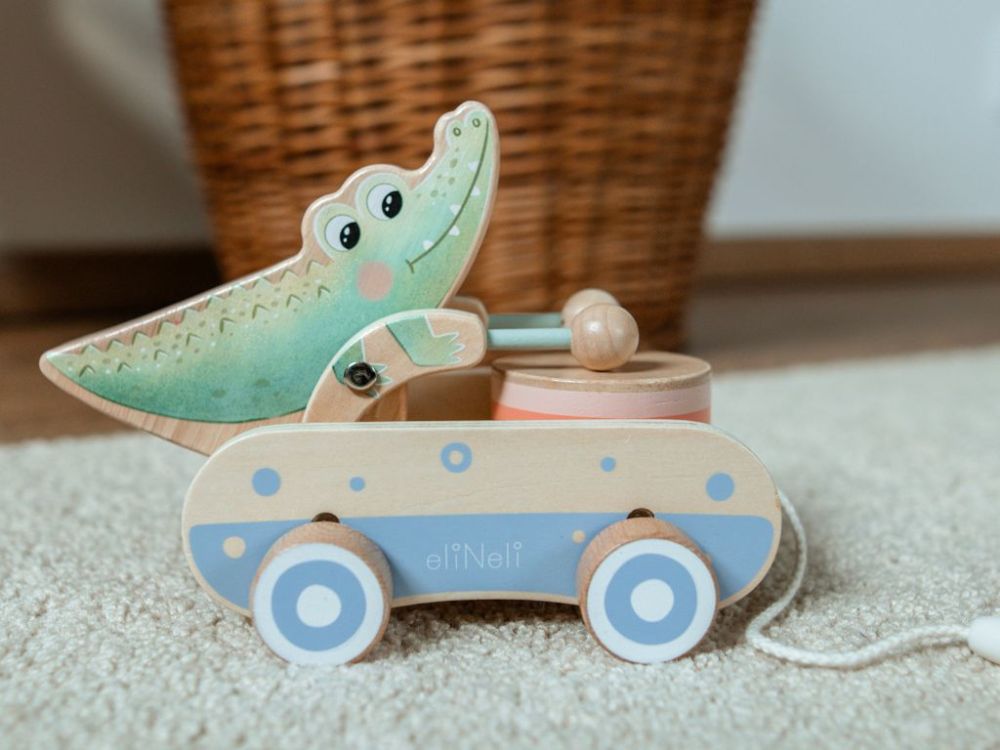 Hölzerne Nachziehspielzeug | Trommelndes Krokodil für Kinder