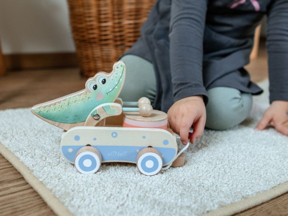 Das hölzerne Nachziehspielzeug in Form eines niedlichen Krokodils wird ein beliebter Begleiter von Kindern bei ihren ersten Schritten sein. Schon wenn es sich auf den Knien bewegt, ermutigt das Krokodil die Kinder mit Begeisterung zu weiteren Versuchen. Während es sich bewegt, klingen seine kleinen Hände mit den Trommelstöcken gegen die Trommel, wodurch ein fröhlicher Rhythmus entsteht, der die Neugier anregt und auf natürliche Weise die musikalische Sensibilität entwickelt.