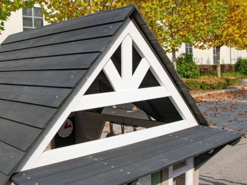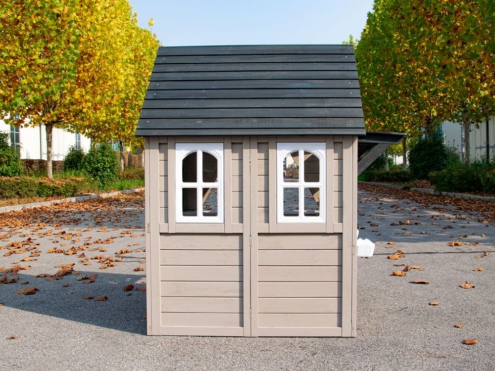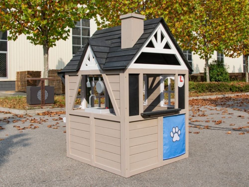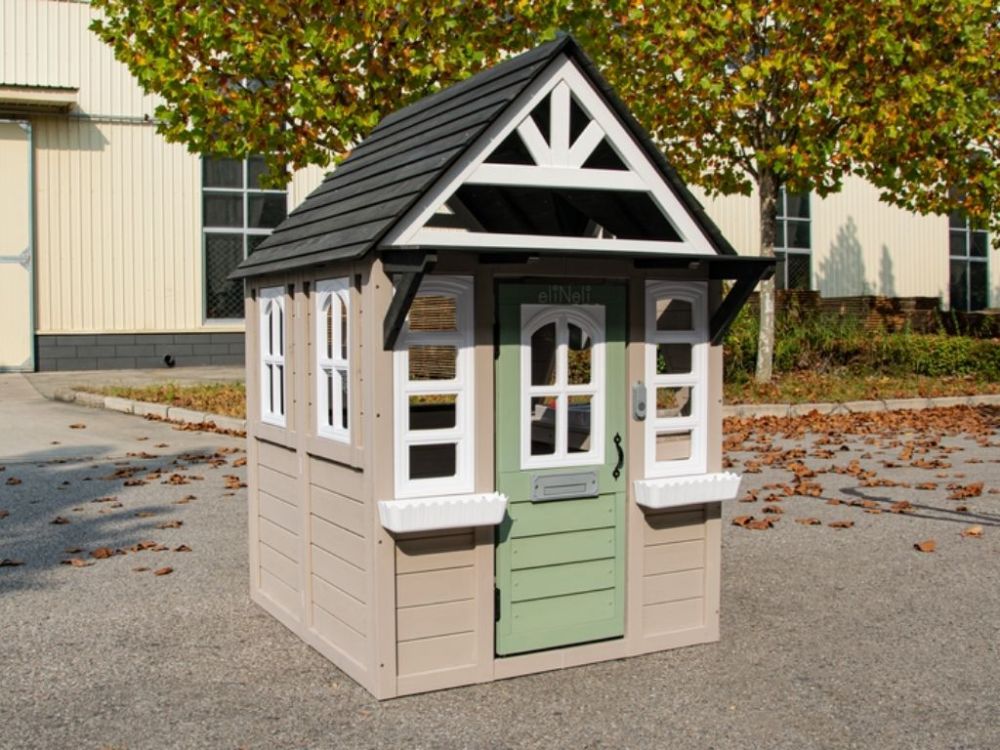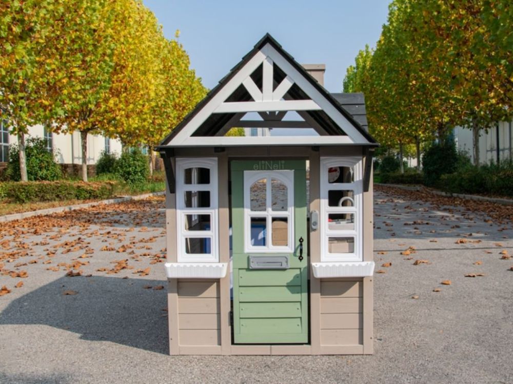 Das Spielhaus verfügt über einen Dachüberstand an der Vorderseite und einen Briefschlitz an der Tür, die für Authentizität sorgen und die Fantasie der Kinder anregen.