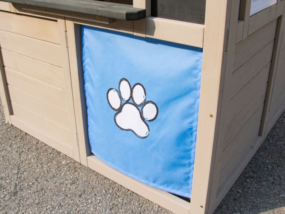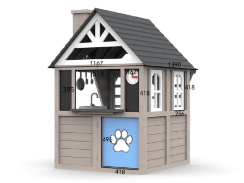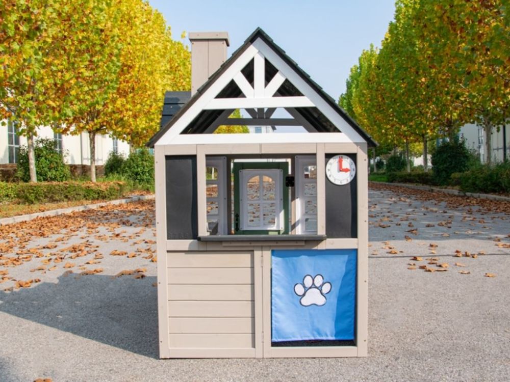 Ein Pfostenloch, ein separater Eingang für Haustiere und zwei Haustierkisten sorgen für realistische Details und erhöhen die Attraktivität des Spielhauses. Im Inneren lädt eine eingebaute Spielküche zu kreativen Spielen und fantasievollen Szenarien ein.