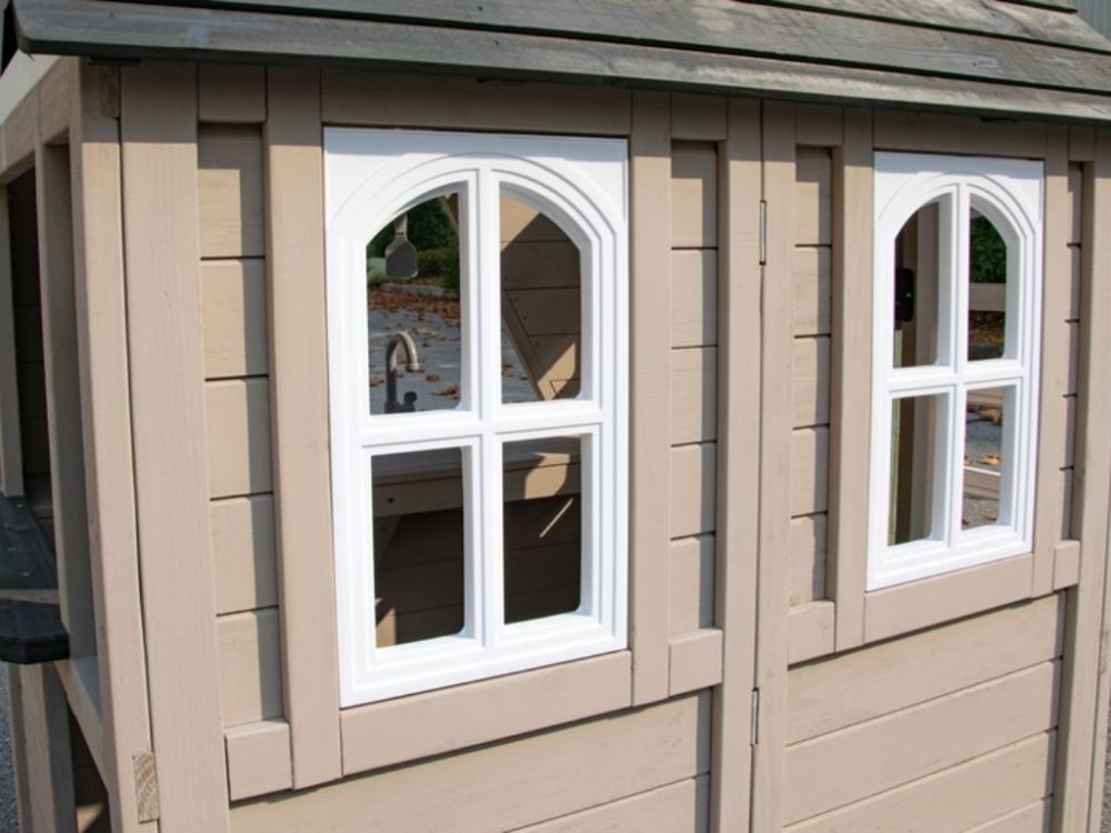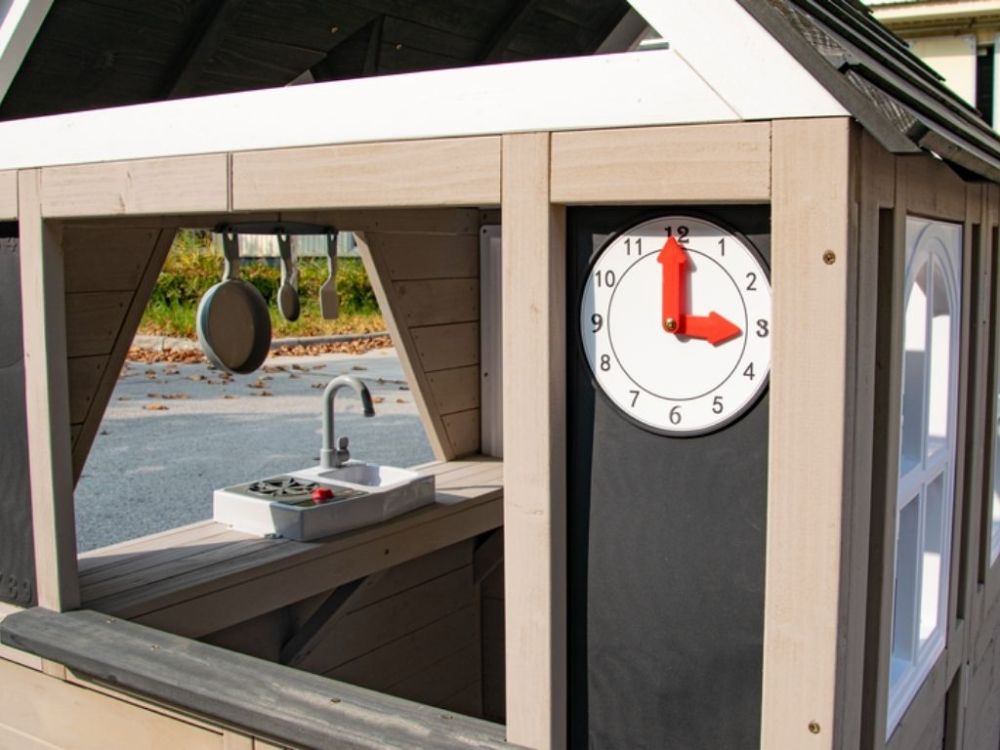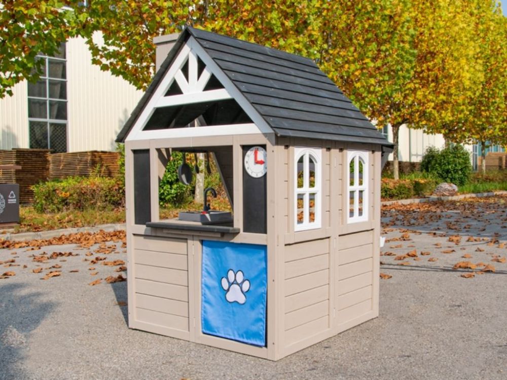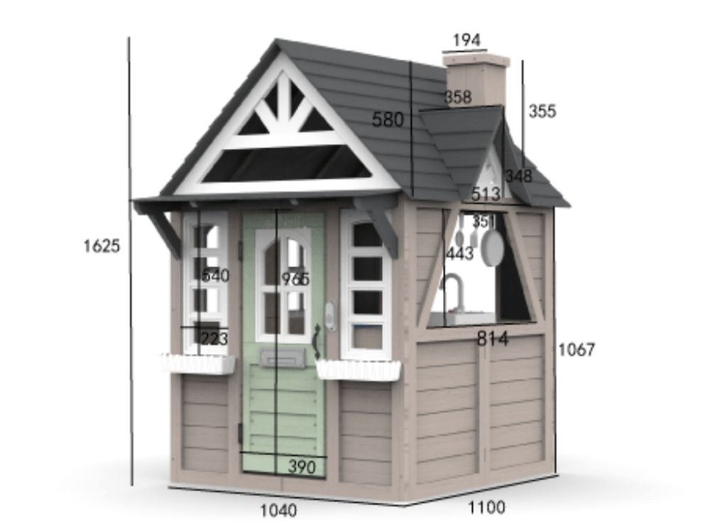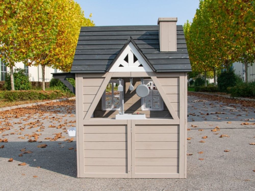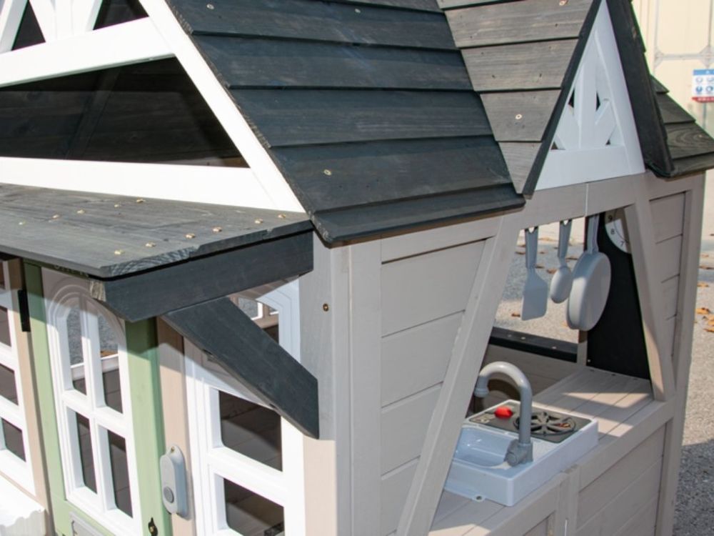 Das klassische Spielhaus für draußen mit Dreiecksfenster, Schornstein und Spielküche für drinnen bietet realistische Details und fördert das fantasievolle Rollenspiel der Kinder.
