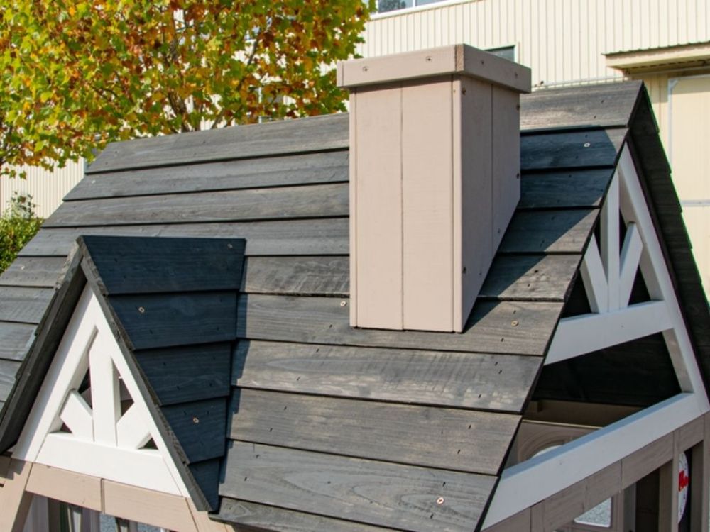 Dieses klassische Spielhaus für draußen verfügt über ein dreieckiges Fenster und einen dekorativen Schornstein.