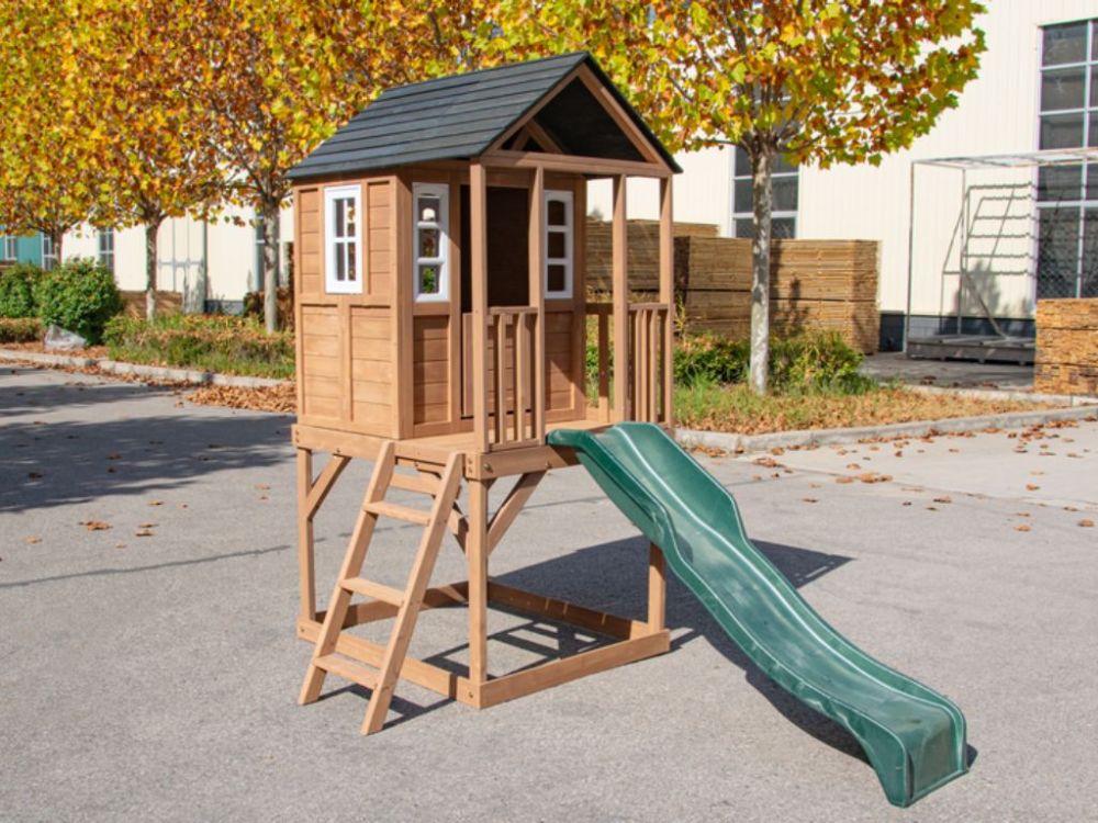 Das erhöhte Holzspielhaus im europäischen Stil mit Plattform, Rutsche und Sandkasten bietet Platz für aktives Spielen und die Entwicklung der Fantasie der Kinder. Eine sichere, langlebige und leicht zu pflegende Ergänzung für jeden Garten.