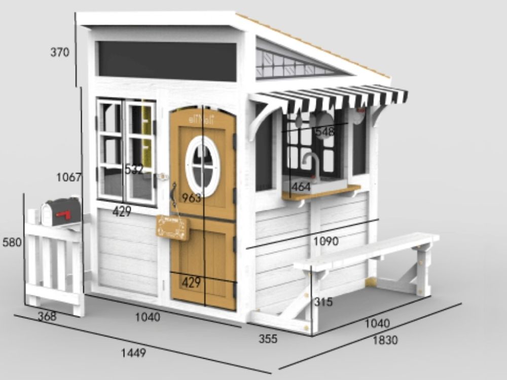 Das Kinder-Gartenhaus aus Holz besticht durch sein modernes Schrägdach, das ihm ein elegantes und zeitloses Aussehen verleiht. Mit seinen klaren Linien fügt es sich natürlich in jeden Garten ein und schafft einen attraktiven Platz zum Spielen für Kinder.