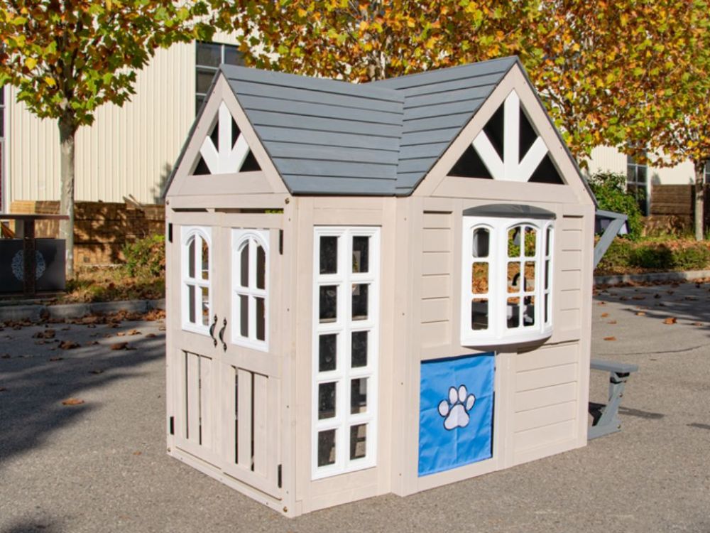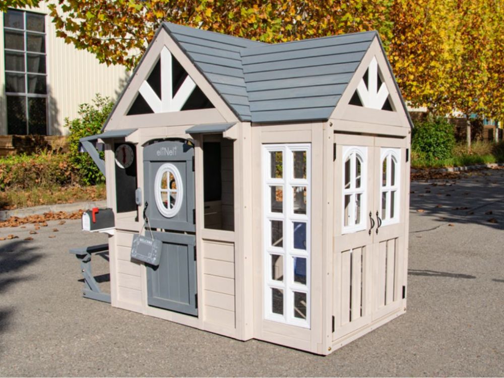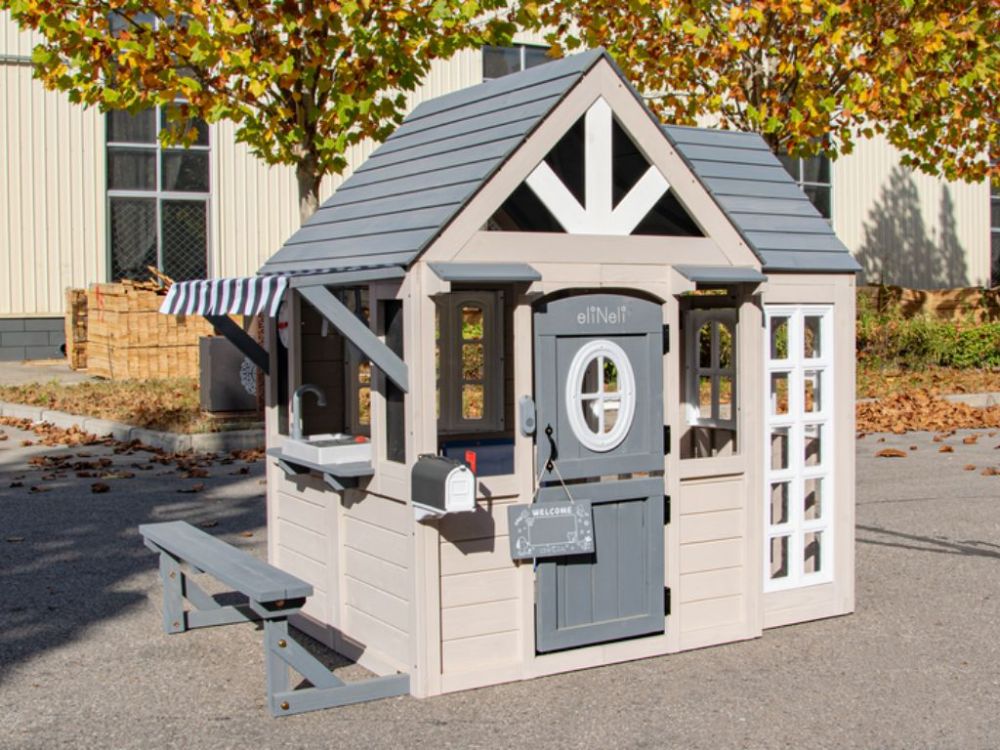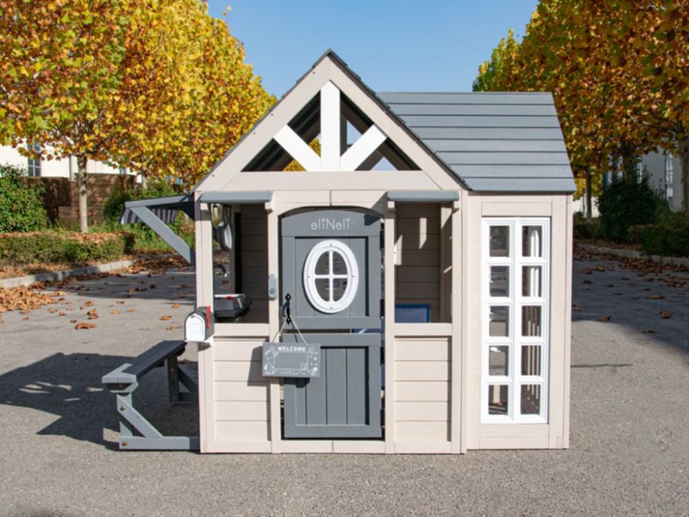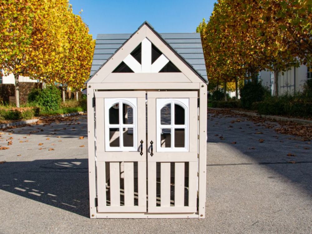 Das Spielhaus verfügt über seitliche Flügeltüren und eine Bank, die zusätzliche Spiel- und Ruhemöglichkeiten bieten. Die Kinder können leicht ein- und aussteigen, das Spiel fördert ihre Unabhängigkeit.