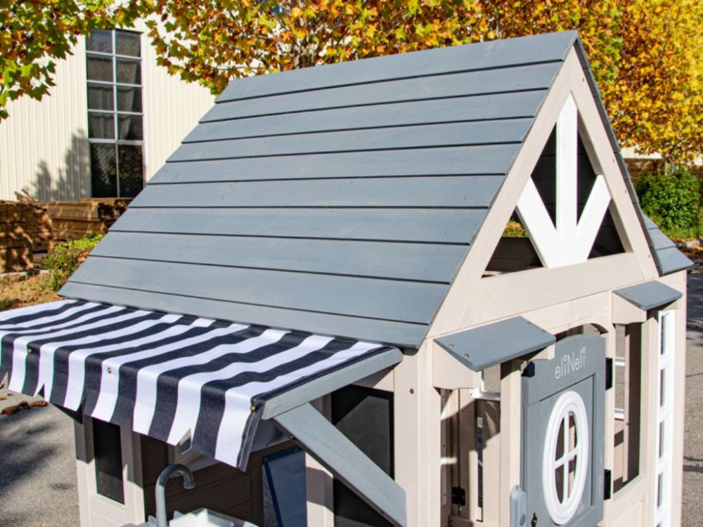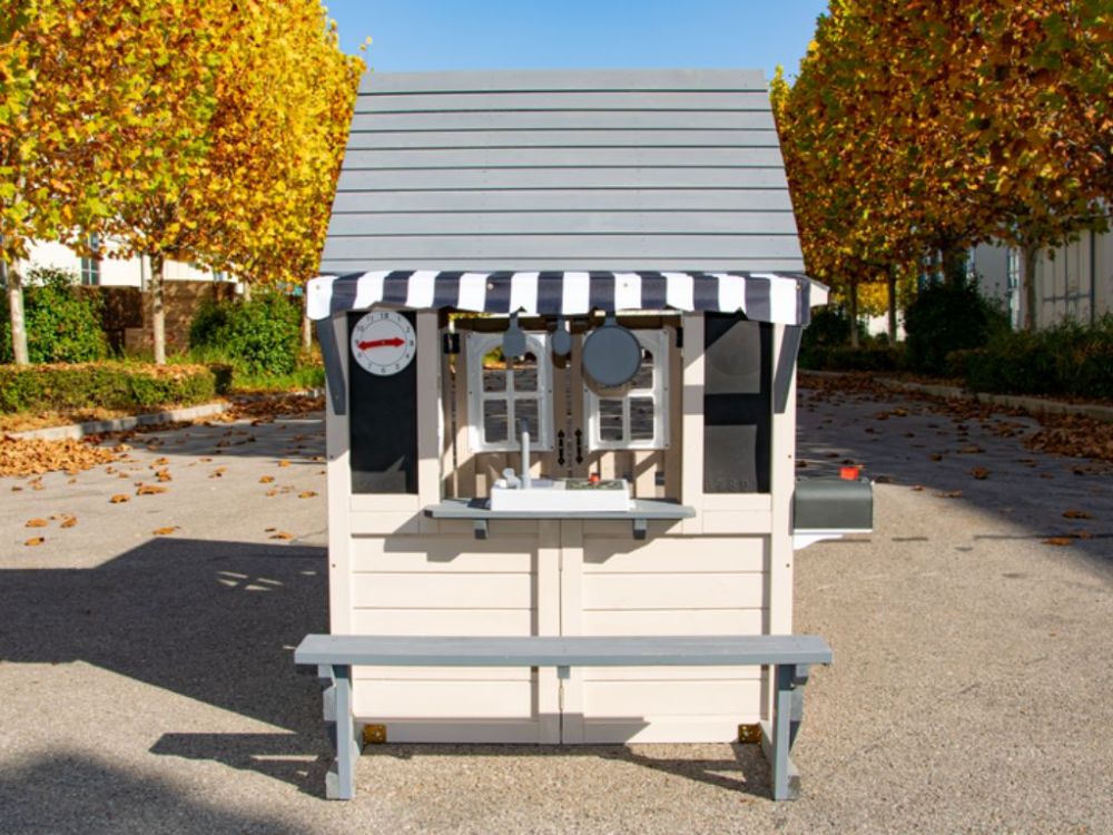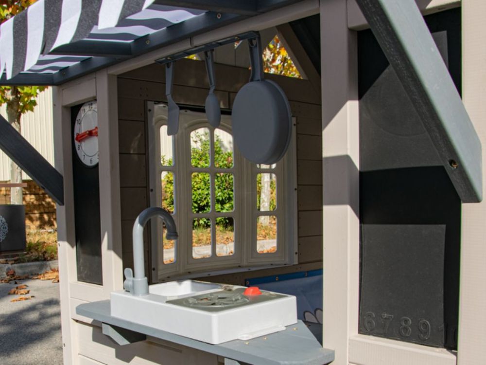 Das Spielhaus verfügt über eine eingebaute Spielküche, die sich unter einem gestreiften Vordach befindet. In dieser Küche können Kinder Koch spielen und ihre Kochkünste entwickeln.