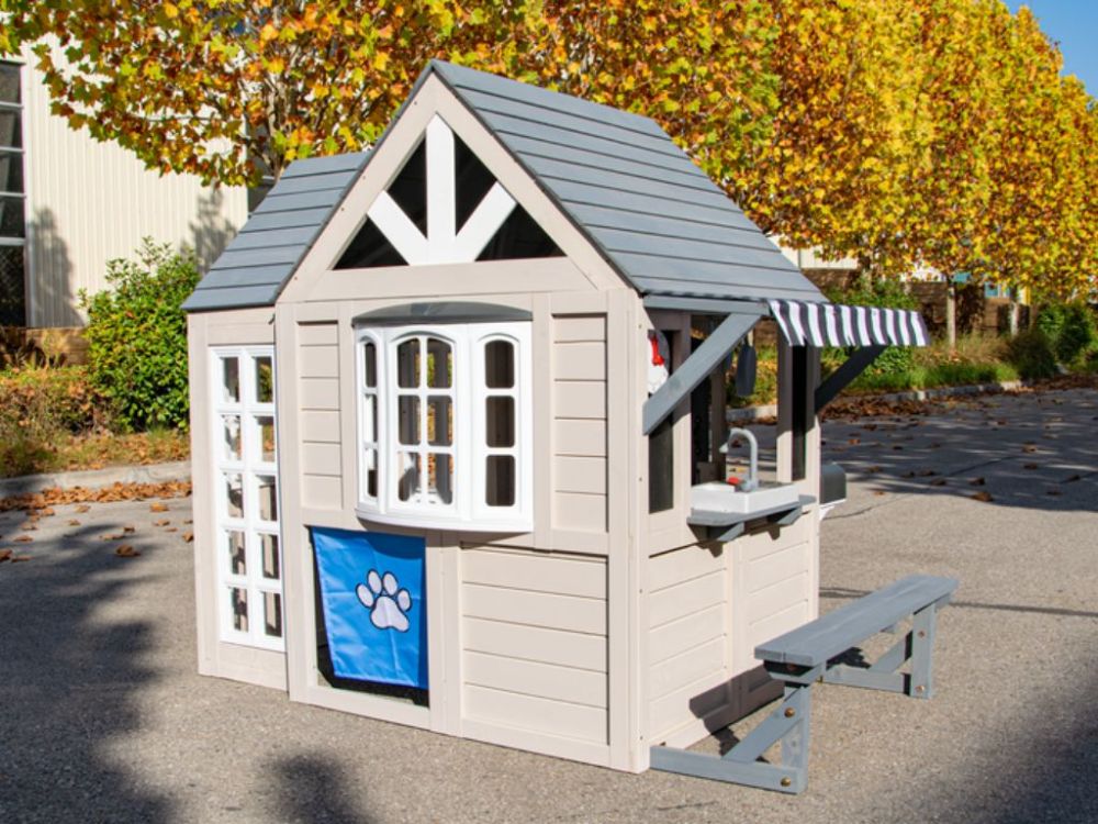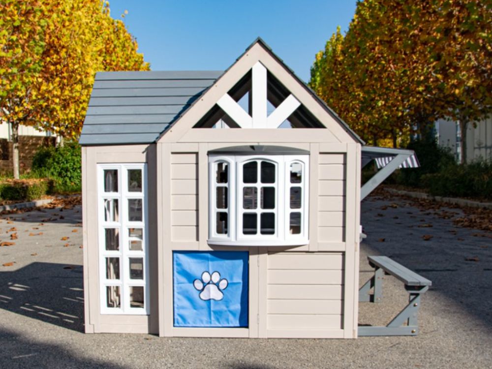 Die Bank ist ein idealer Ort, um sich nach dem Spielen auszuruhen oder um mit Freunden zusammenzusitzen. Sie kann auch für die "Kunden" des Verkaufsfensters umgeklappt werden. Diese Funktion trägt zum Gesamtkomfort und zur Funktionalität des Spielhauses bei. Ein praktisches Detail ist der Eingang für Haustiere.