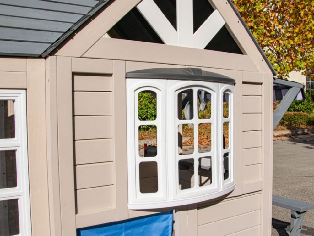 Die Konstruktion ist stark und stabil, was die Sicherheit beim Spielen gewährleistet. Das Spielhaus ist so konstruiert, dass es auch rauen Bedingungen standhält und den Kindern eine sichere Umgebung zum Spielen im Freien bietet.