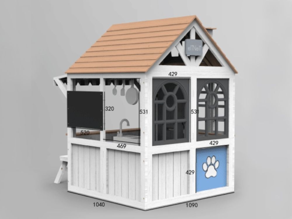 Das Spielhaus für draußen bietet Platz für kreatives Spielen mit einem Schaufenster, einer beweglichen Bank, einer Küche mit Utensilien und einer Kreidetafel. Holländische Türen, magnetische Fenster, ein Briefkasten an der Tür und ein Eingang für Haustiere fördern das interaktive Spiel.