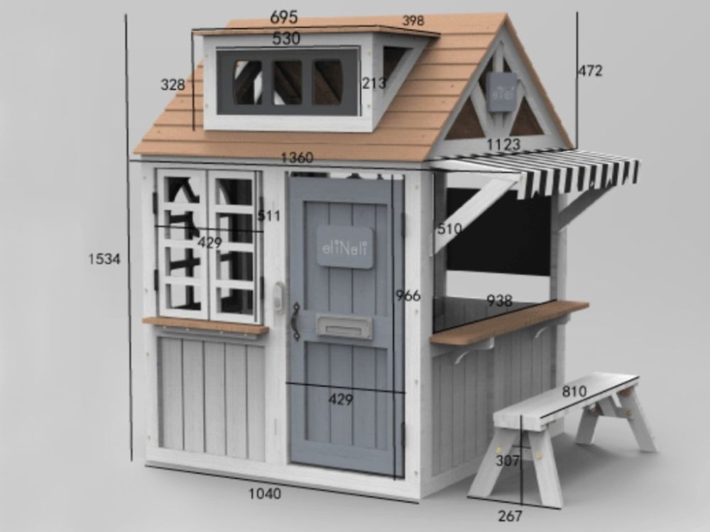 Das Outdoor Spielhaus ist als Kinderladen konzipiert, der Kinder auf natürliche Weise dazu anregt , Verkaufen, Kommunikation und Zusammenarbeit zu spielen. Ein Verkaufsfenster mit einer Markise und einer beweglichen Bank schafft einen Raum für interaktive Rollenspiele, in dem Kinder verschiedene Alltagssituationen ausprobieren können.