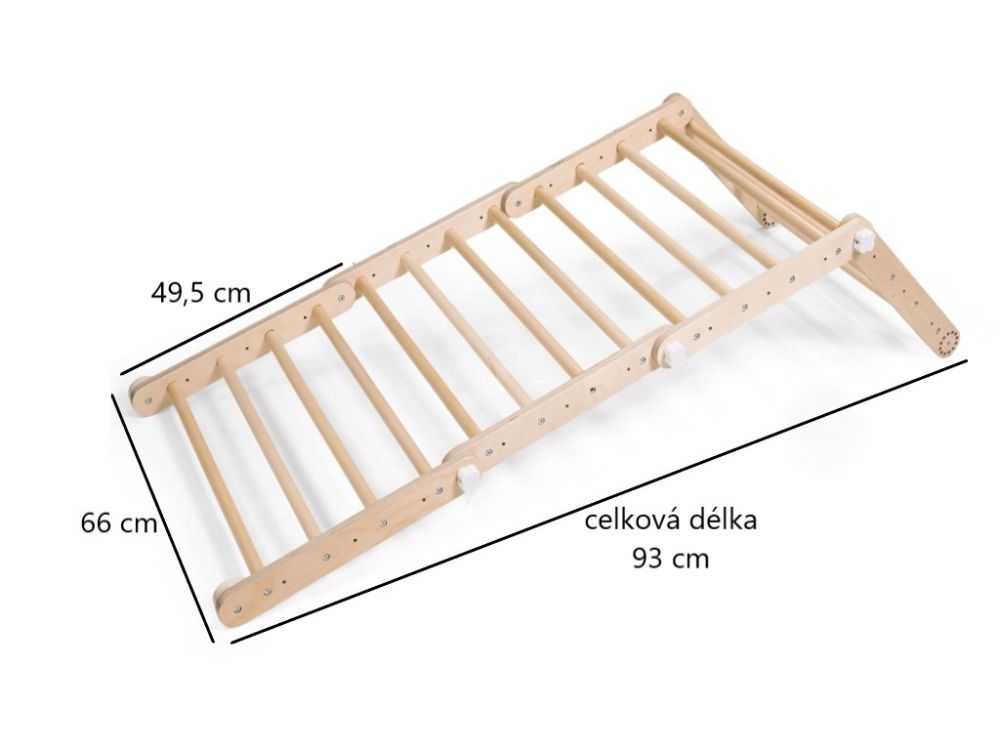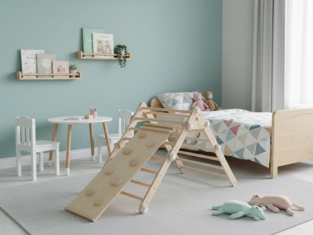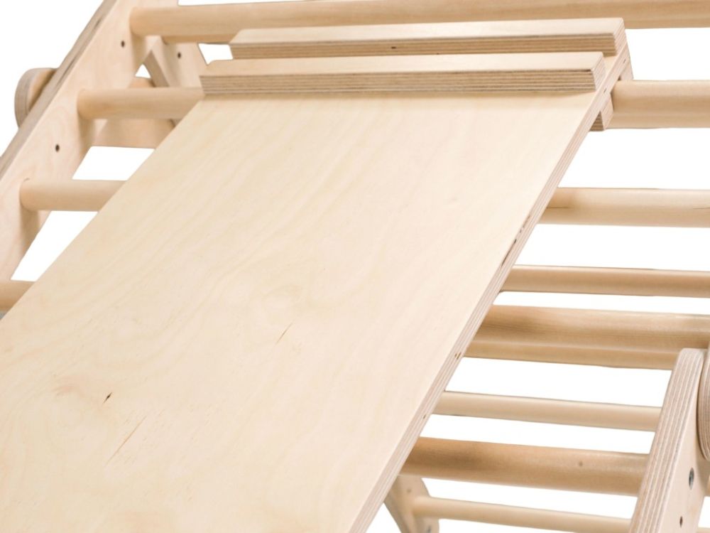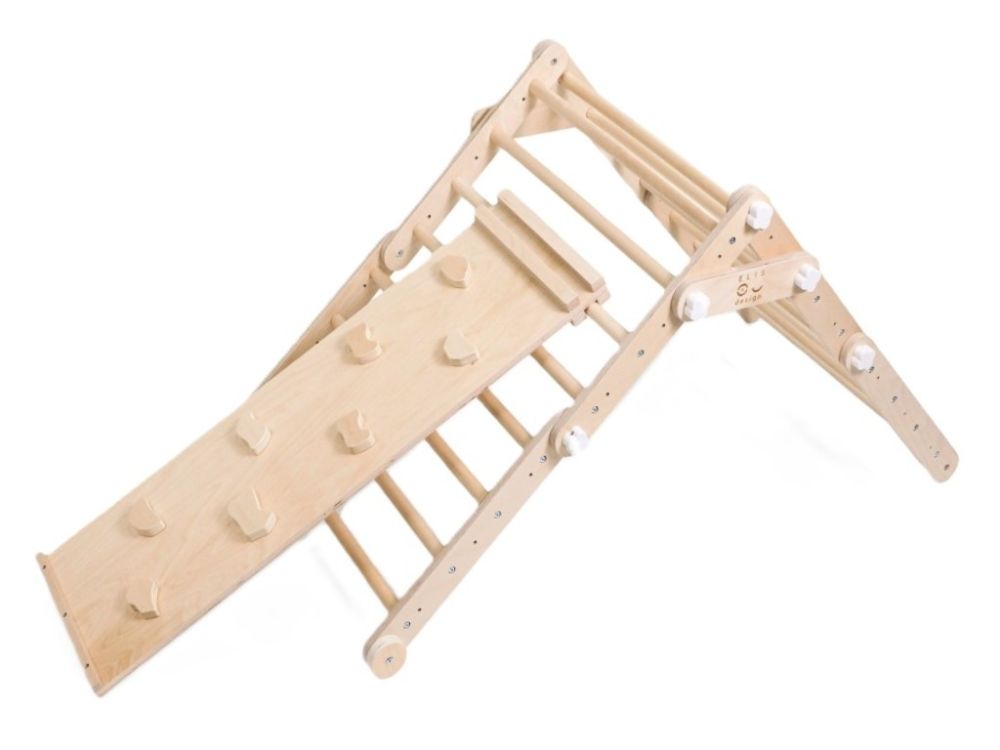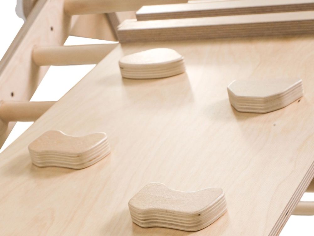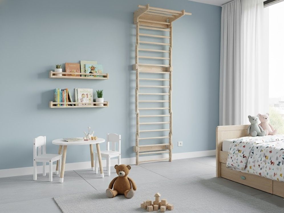 Wenn Sie alle Teile an der Wand befestigen, erhalten Sie eine Leiter- und Trapezanordnung, die Kindern einen sicheren Raum für motorische Entwicklung und aktiven Spaß bietet.