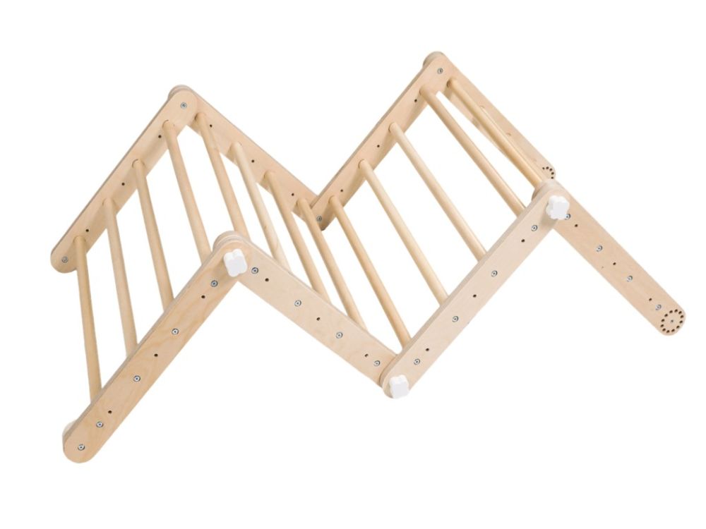 Das VARIO Kinderkletterwand - Leitern 3in1 vereint das variable Piklerdreieck mit doppelseitigem Brett, die Hängeleiter mit Trapez und das kleine Piklerdreieck zu einem sicheren und lustigen Set. Es fördert Bewegung, Gleichgewicht, Kraft und Koordination und kann dank seines modularen Aufbaus als Spielplatz direkt im Kinderzimmer an der Wand montiert werden.