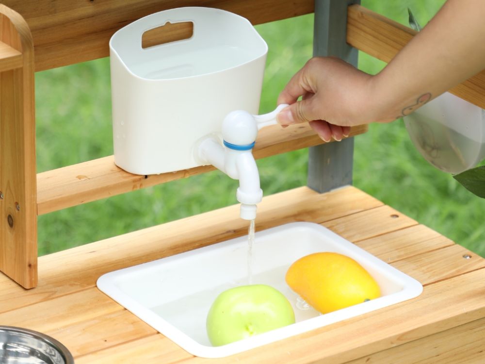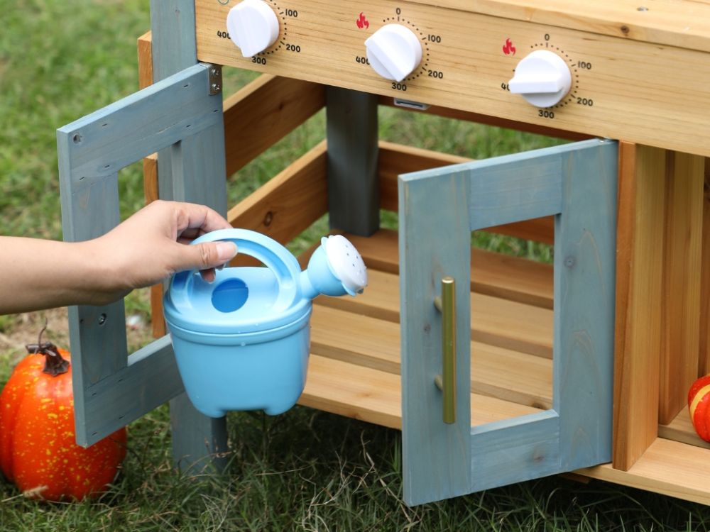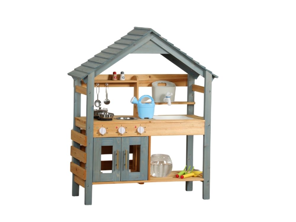 Gefertigt aus massivem Tannenholz, überzeugt die Kinderküche durch Stabilität, Langlebigkeit und ein natürliches Design – ideal für den regelmäßigen Einsatz im Außenbereich.