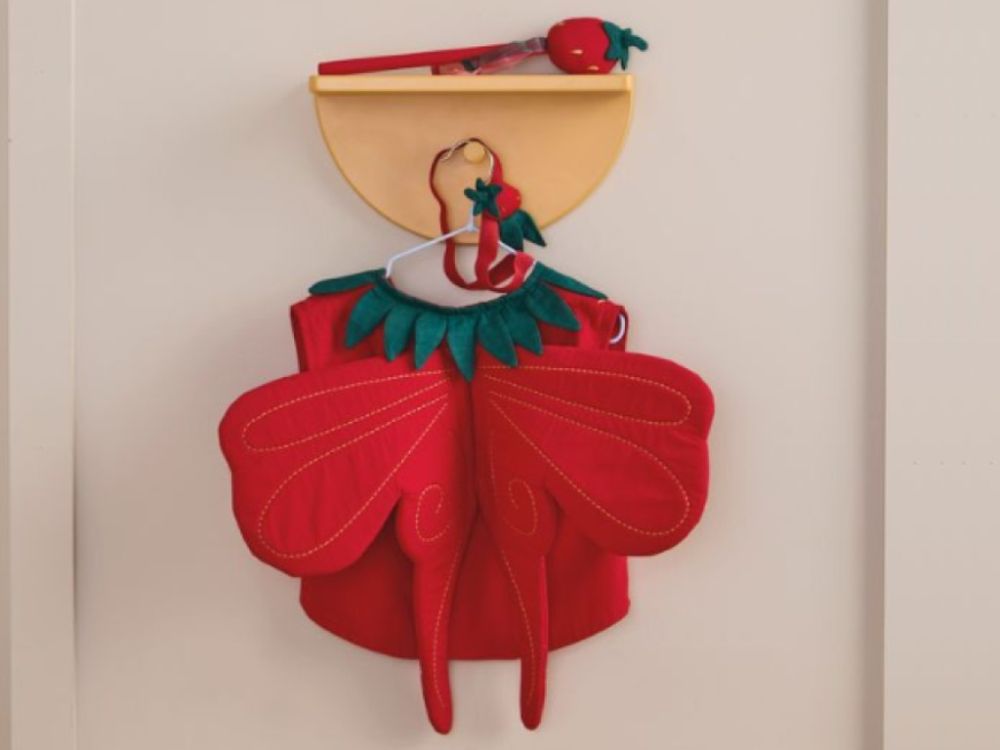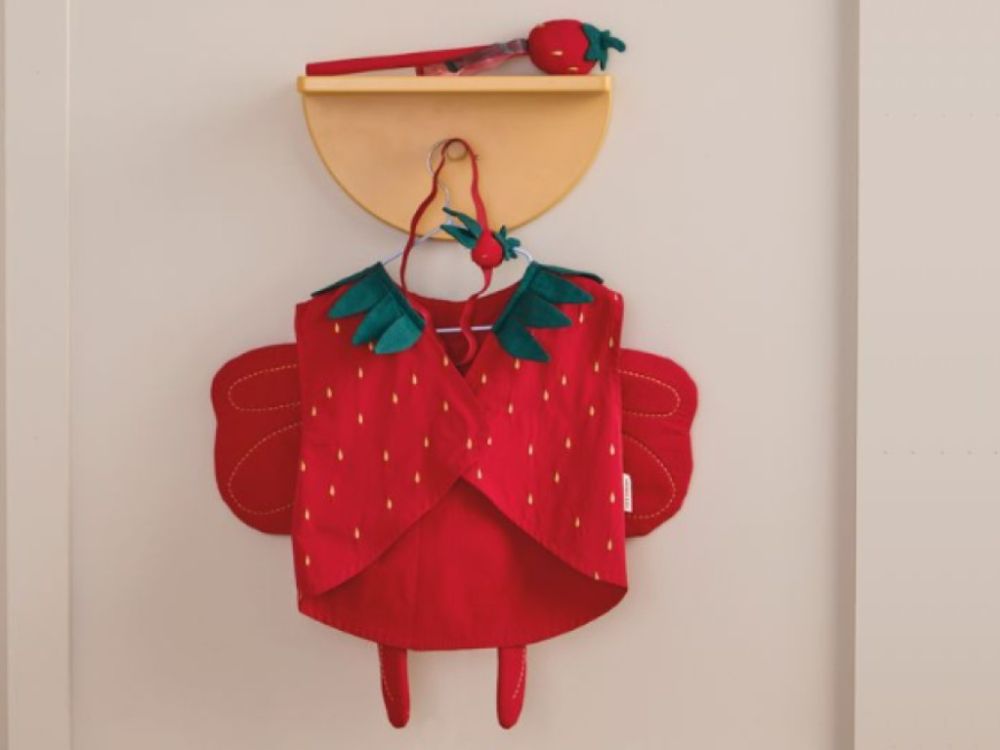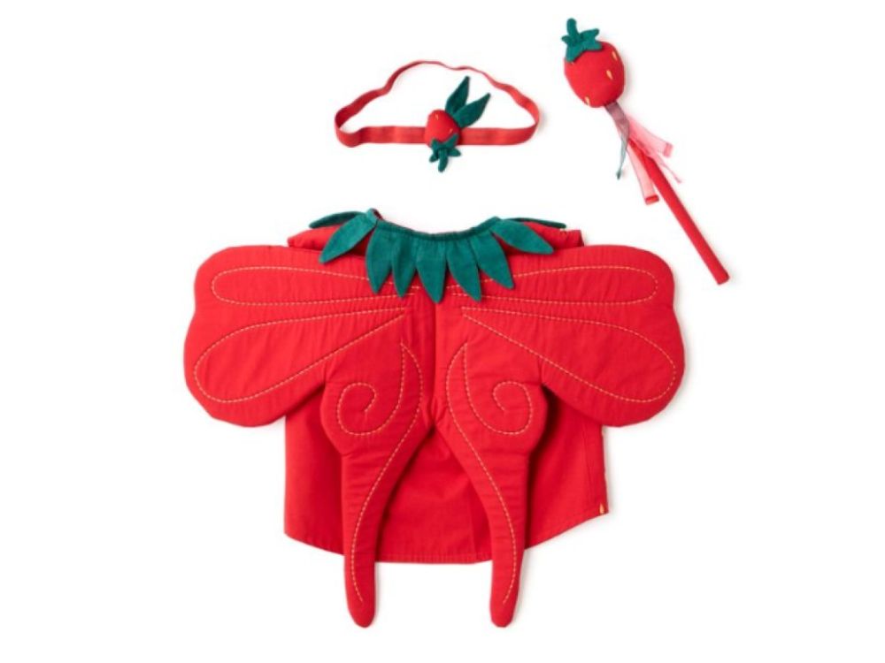 Ein niedliches Erdbeerkostüm bringt den Zauber des Sommers, Fantasie und erfrischende Abenteuer ins Kinderspiel. Die rote Weste hat eine abgerundete Vorderseite, einen grünen Kragen mit Blättern und einen praktischen Klettverschluss, der das An- und Ausziehen erleichtert. Die Rückseite des Kostüms ist mit kleinen ausgestopften Flügeln verziert, die dem ganzen Set einen märchenhaften Touch verleihen. Das Kostüm ist nicht nur eine stilvolle Verkleidung, sondern auch ein großartiges Werkzeug für die Entwicklung von Fantasie und kreativem Spiel. Es gibt auch ein Stirnband mit einer dekorativen Erdbeere und einen passenden Zauberstab, mit dem Kinder ihre Welt zum Beispiel in einen magischen Erdbeergarten verwandeln können.