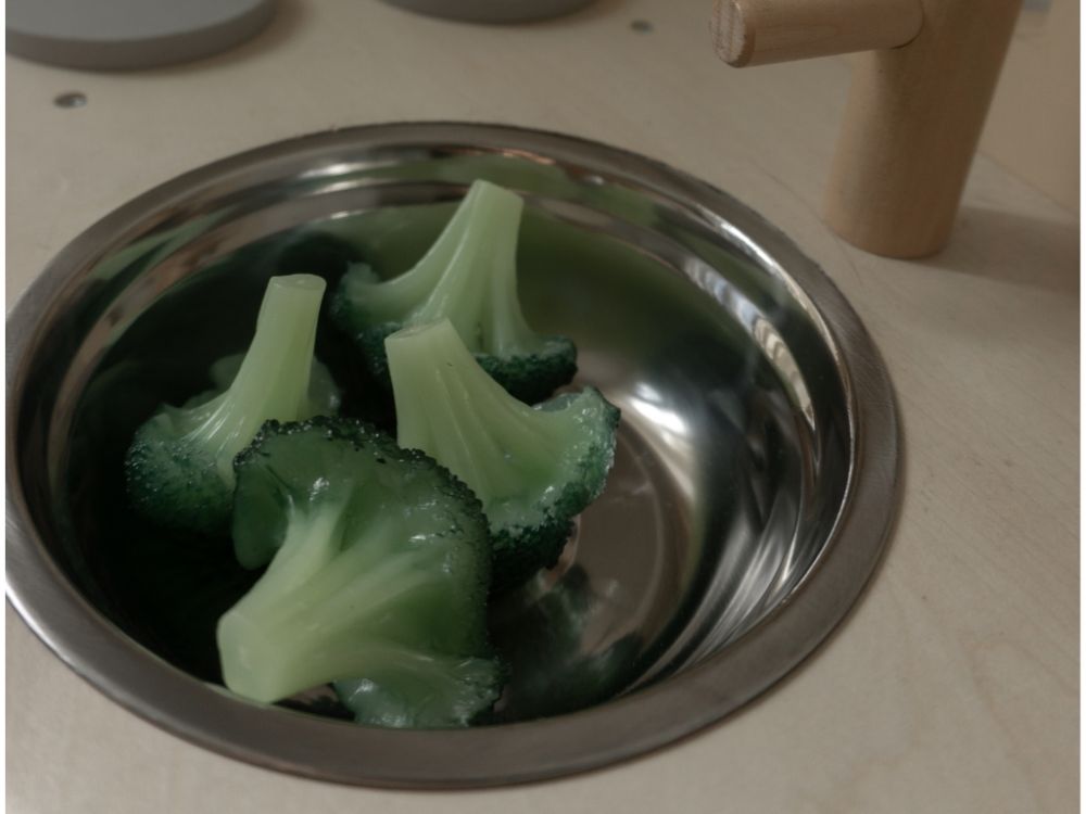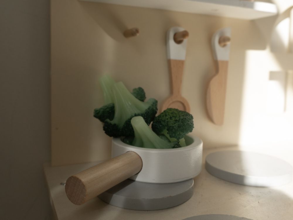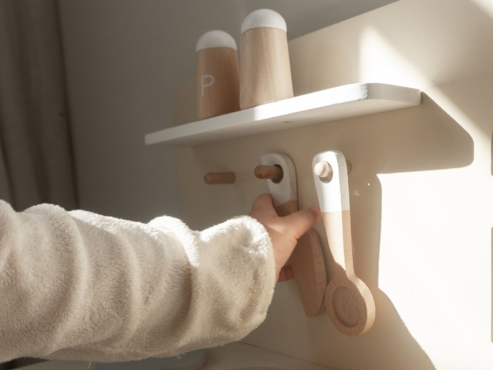 Die Kinderküche aus Holz ist ein pädagogisches Spielzeug, mit dem Kinder auf sichere und kindgerechte Weise Tätigkeiten wie Kochen, Backen, Abwaschen und Zubereiten von Speisen ausprobieren können . In dieser Küche werden Kinder schnell in die Rolle eines Meisterkochs schlüpfen und mit allen Zutaten backen und kochen, die sie bei Ihnen zu Hause finden. Lassen Sie sich von den originellen Kombinationen und Gerichten überraschen, die Ihr Kind erfinden wird. Die Küche verfügt über eine Grundausstattung - Backofen und Herd mit 2 Kochplatten, ein Spülbecken für das Geschirr, Stauraum, Regal, Hängestange an der Seite der Küche. Die Küchenzeile ist mit Holzutensilien ausgestattet - ein Topf mit Deckel, eine Bratpfanne, Gewürze, ein Kocher, ein Wender und ein Messer. Die Kinderküche ist originell gestaltet und hat ein Fenster über der Spüle. Beim Spielen in der Kinderküche verbessern die Kinder ihre motorischen Fähigkeiten, ihre Hand-Augen-Koordination , ihre manuelle Geschicklichkeit, entwickeln ihre Fantasie und Kreativität, machen Rollenspiele und bauen soziale Bindungen auf.