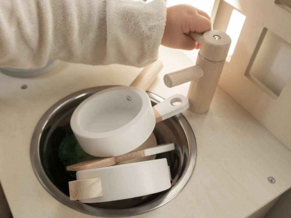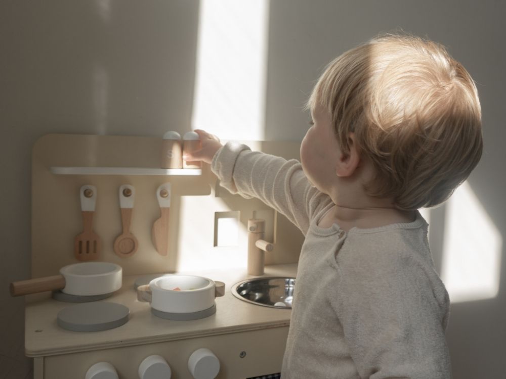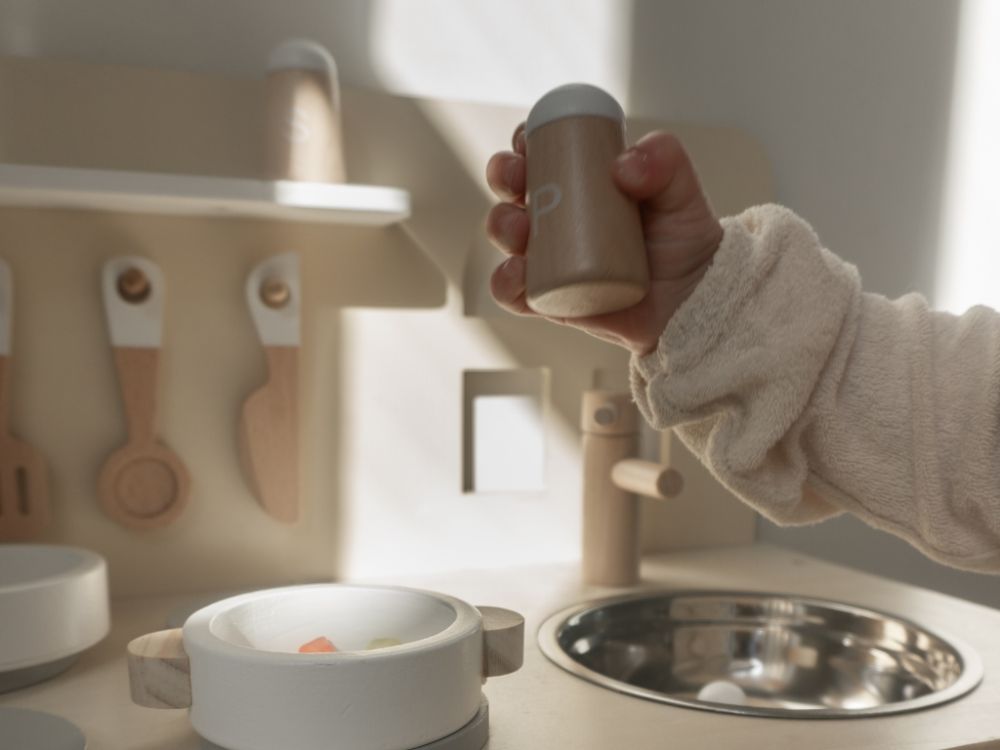 Die Kinderküche in sanften Pastellfarben, mit Geräten, Zubehör und einem Fenster wird jeden kleinen Koch und jede Hausfrau begeistern. In der Kinderküche können die Kinder kochen, backen, abwaschen und Mahlzeiten auf kindersichere Weise zubereiten. Beim Spielen in der Kinderküche aus Holz trainieren die Kinder ihre Fähigkeiten und haben dabei noch jede Menge Spaß.