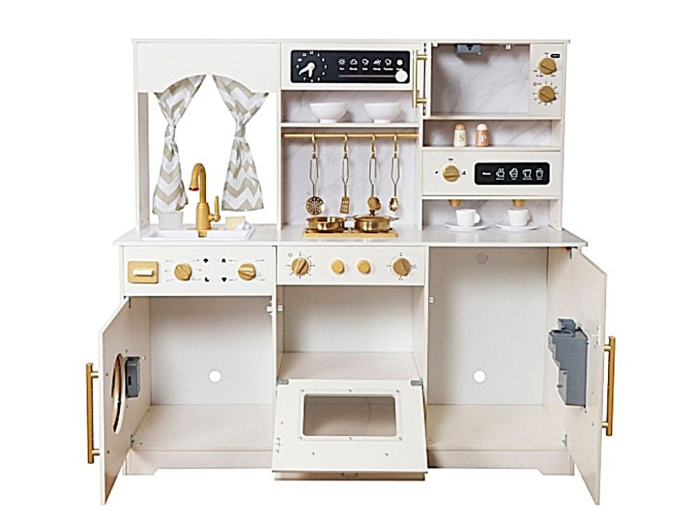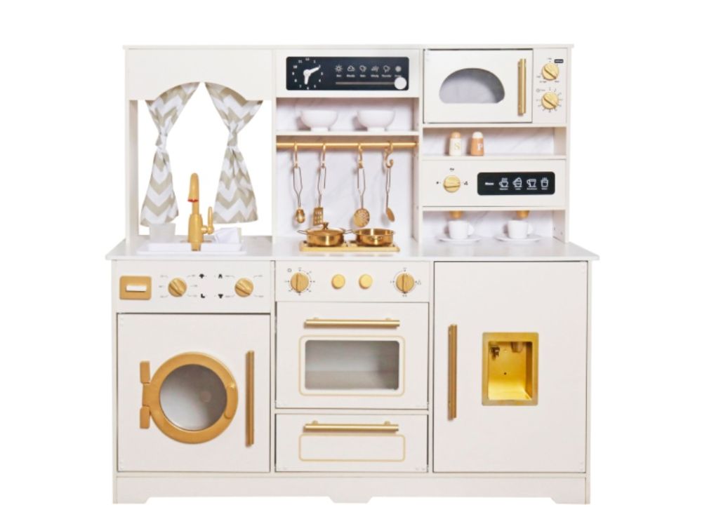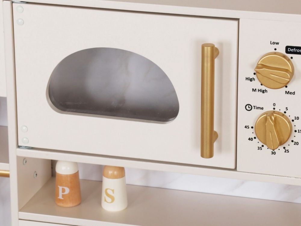 Die Kinderküche aus Holz in Sahnefarbe mit goldenen Details wird Kinder und Eltern gleichermaßen begeistern. Sie enthält eine Spüle mit fließendem Wasser, einen Herd mit Dampf, Licht und Ton, einen Backofen, eine Mikrowelle, einen Kühlschrank mit Eismaschine, eine Waschmaschine, eine Kaffeemaschine und ein Geschirr-Set. Die interaktive Küche für Kinder fördert Fantasie, Motorik und Kreativität. Beim spielerischen Kochen und bei der Hausarbeit gewinnen die Kinder ein Verständnis für die Führung eines Haushalts und lernen wichtige Fähigkeiten.