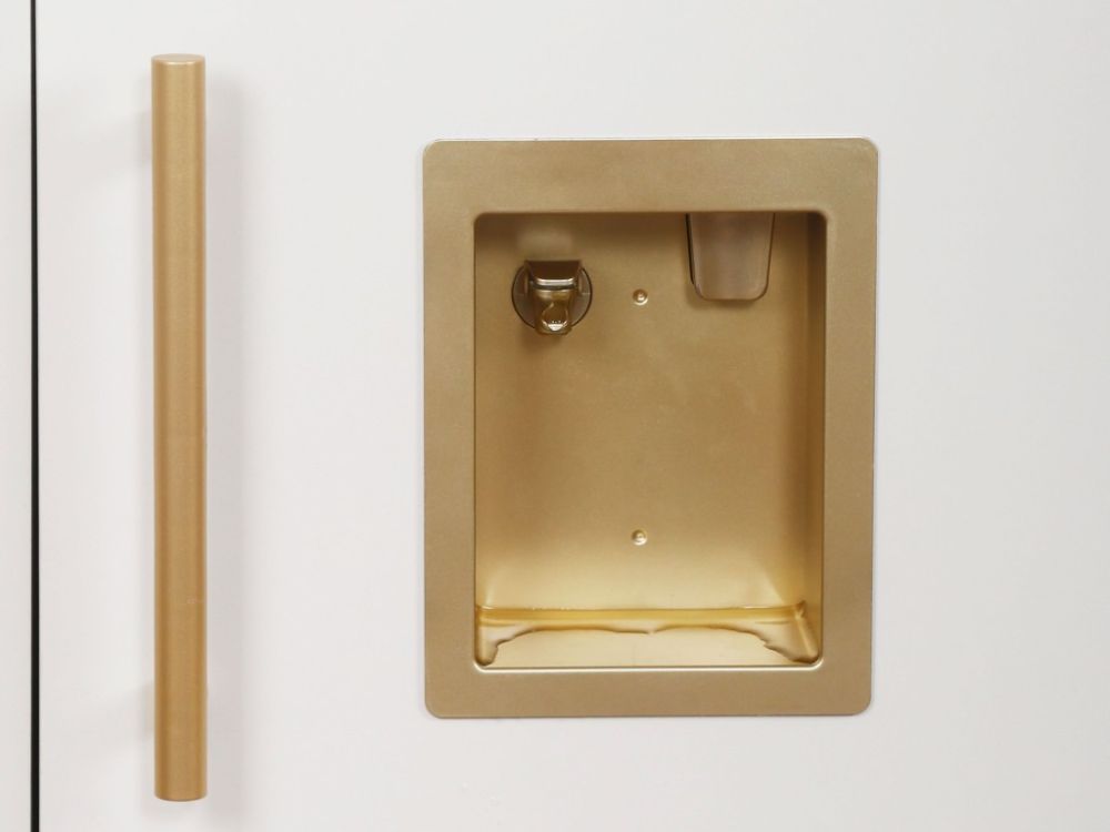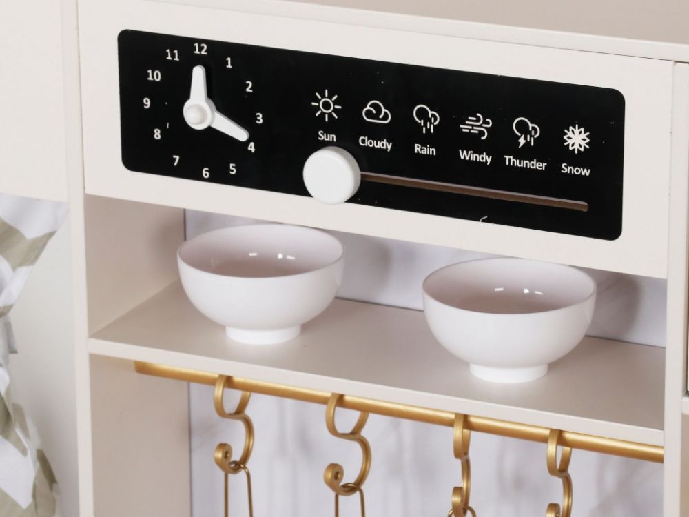 Die einzigartige Kinderküche aus Holz in eleganter Sahnefarbe mit goldenen Details, einem Fenster, vielen Geräten, cleveren Funktionen und schönen Details wird Kinder und Eltern gleichermaßen begeistern. Das realistische Zubehör hebt das Spielen auf ein neues Niveau: In der Küche können Kinder alles tun, was sie aus dem Haushalt kennen - backen, kochen, braten, waschen, Geschirr unter echtem Wasser abspülen, verschiedene Kaffeesorten zubereiten, Getränke mit Eiswürfeln auffüllen, Speisen erhitzen oder Wasser direkt aus dem Kühlschrank abfüllen. Der Herd gibt realistische Kochgeräusche von sich, leuchtet auf und erzeugt Dampf, der von den Kochfeldern aufsteigt, um den perfekten Eindruck vom echten Kochen zu vermitteln. Auch das Wäschewaschen wird von Geräusch- und Lichteffekten begleitet.