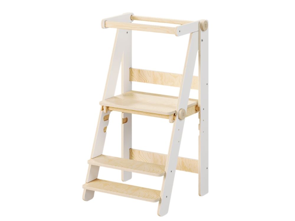Die klappbare Konstruktion ermöglicht es, den Lernturm einfach zusammenzuklappen und platzsparend zu verstauen, wenn er nicht gebraucht wird. Dadurch nimmt er kaum Platz ein und lässt sich flexibel in der Küche, im Bad oder im Kinderzimmer einsetzen.