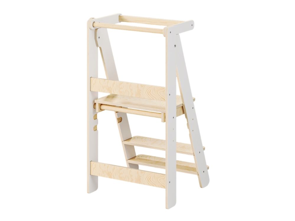 Das schlichte und funktionale Design in Weiß und Naturholz fügt sich harmonisch in moderne wie auch klassische Einrichtungen ein. So verbindet der Lernturm praktischen Nutzen mit einer ansprechenden Optik für den Alltag.