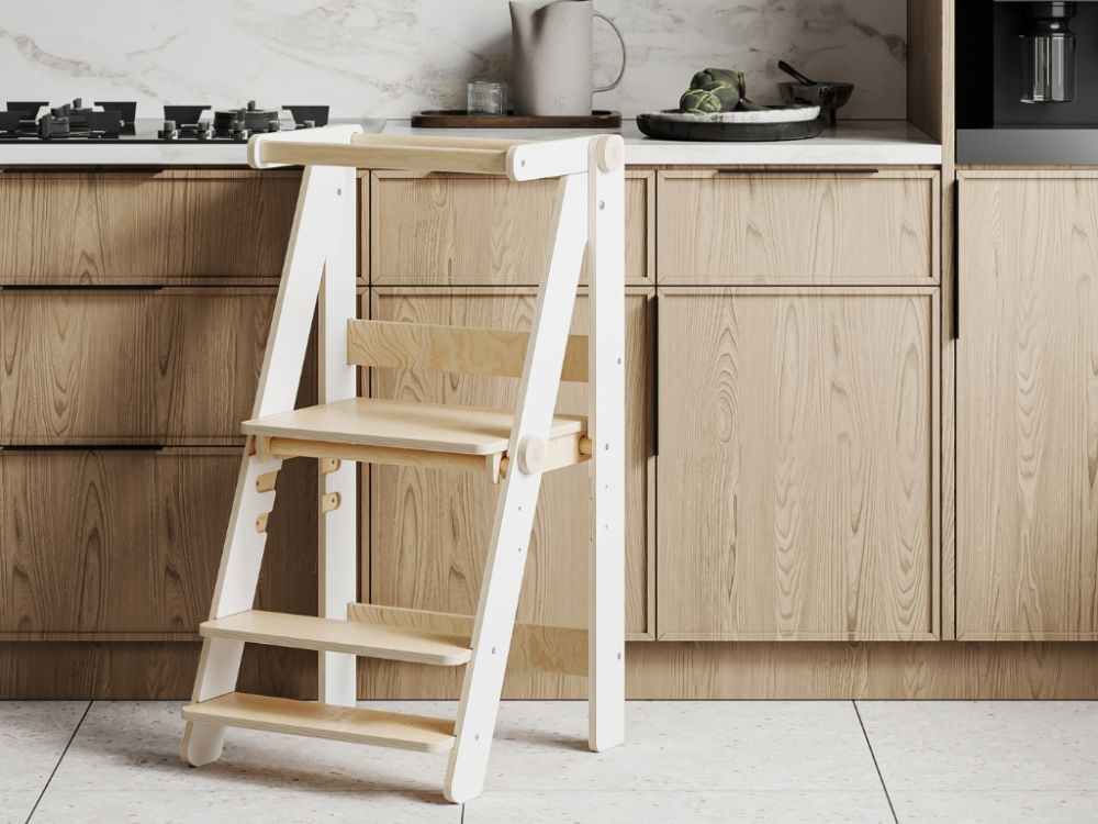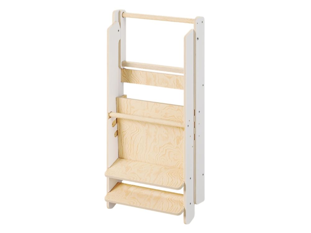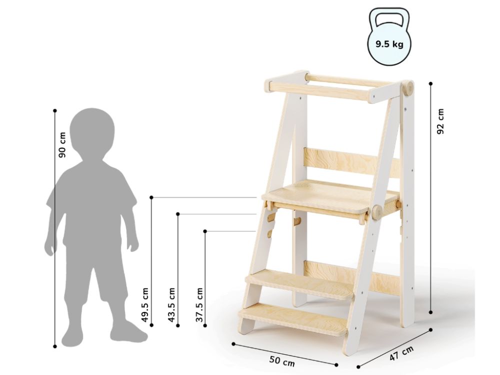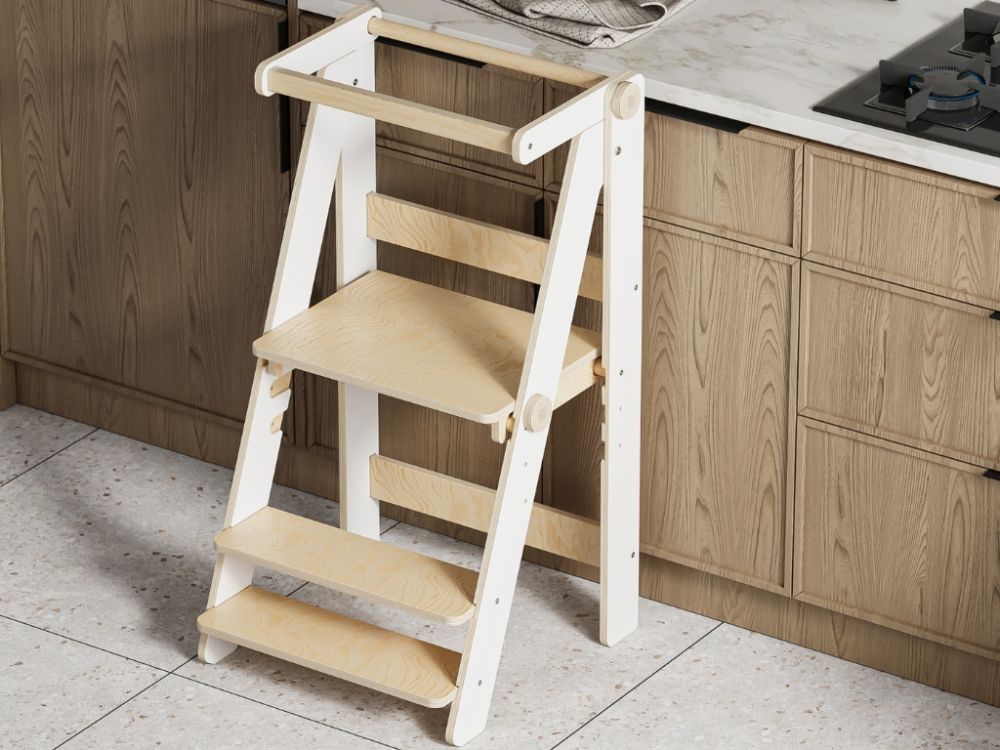 Die klappbare Konstruktion ermöglicht es, den Lernturm einfach zusammenzuklappen und platzsparend zu verstauen, wenn er nicht gebraucht wird. Dadurch nimmt er kaum Platz ein und lässt sich flexibel in der Küche, im Bad oder im Kinderzimmer einsetzen.
