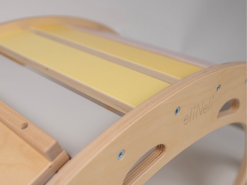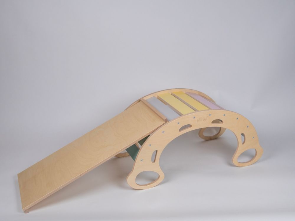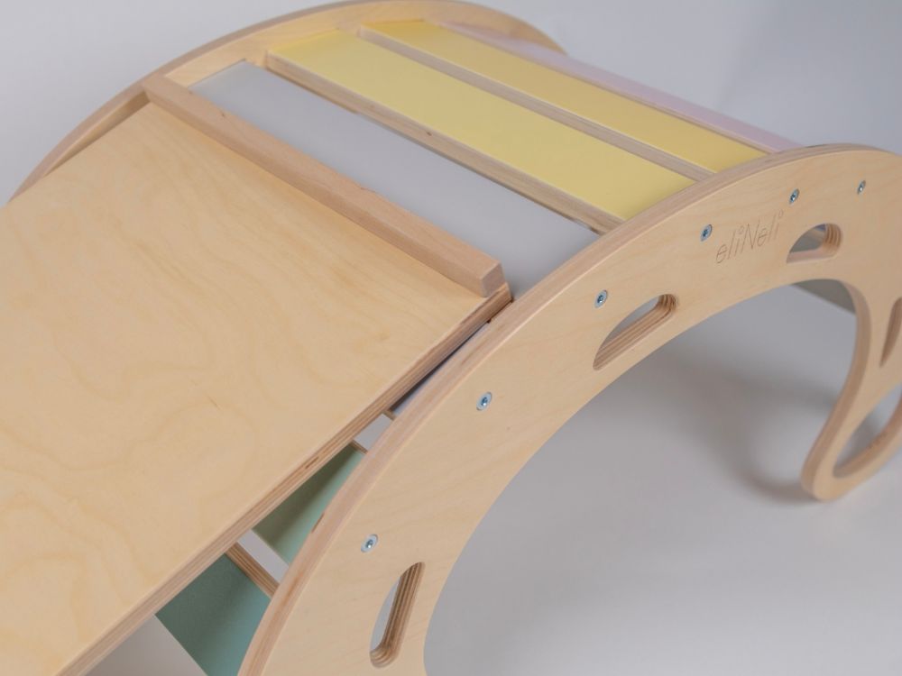 Schaffen Sie schnell und einfach einen kleinen Spielplatz bei sich zu Hause. Alles, was Sie dazu brauchen, ist diese tolle pastellfarbene 5-in-1-Holzschaukel mit doppelseitigem Brett - auf der einen Seite eine Rutsche, auf der anderen ein Kletterbrett. Die Holzschaukel, in einer farbenfrohen Kombination aus Naturholz und angenehmen Pastellfarben, ist ein multifunktionales Spielzeug für das Kinderzimmer, das Kinder nicht nur für Bewegungsspiele selbstständig nutzen können. Auf der Montessori-Schaukel können Kinder schaukeln oder sich beim sanften Schaukeln einfach nur angenehm entspannen. Für maximalen Komfort wird die Schaukel durch einen weichen Bezug ergänzt. Die Schaukel eignet sich hervorragend als Klettergerüst und Rutsche für den Innenbereich. Kinder können darüber klettern, darunter krabbeln, sich darunter verstecken, darauf rutschen, darauf sitzen oder liegen. Bei Kinderspielen kann sie eine Brücke, ein Tunnel, ein Haus und eine Theke sein. Wenn es mit einem doppelseitigen Brett verbunden wird, verwandelt es sich leicht in einen Spielplatz, auf dem die Kinder rutschen oder an der Seite mit Klettergriffen klettern können . Mit dem pastellfarbenen Holzschaukel- und Brettset haben Kinder viel Spaß, bringen ihren ganzen Körper in Bewegung, stärken ihre Muskeln und verbessern ihre motorischen Fähigkeiten.
