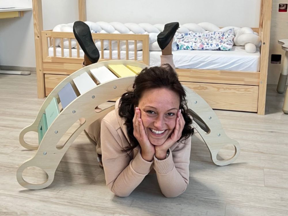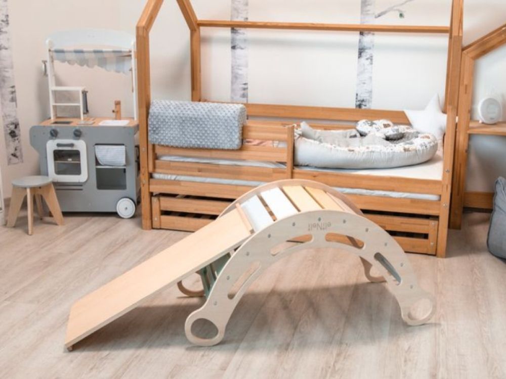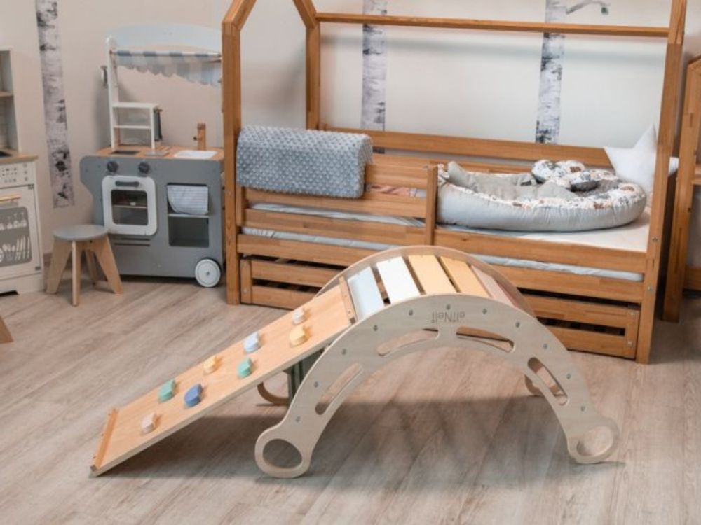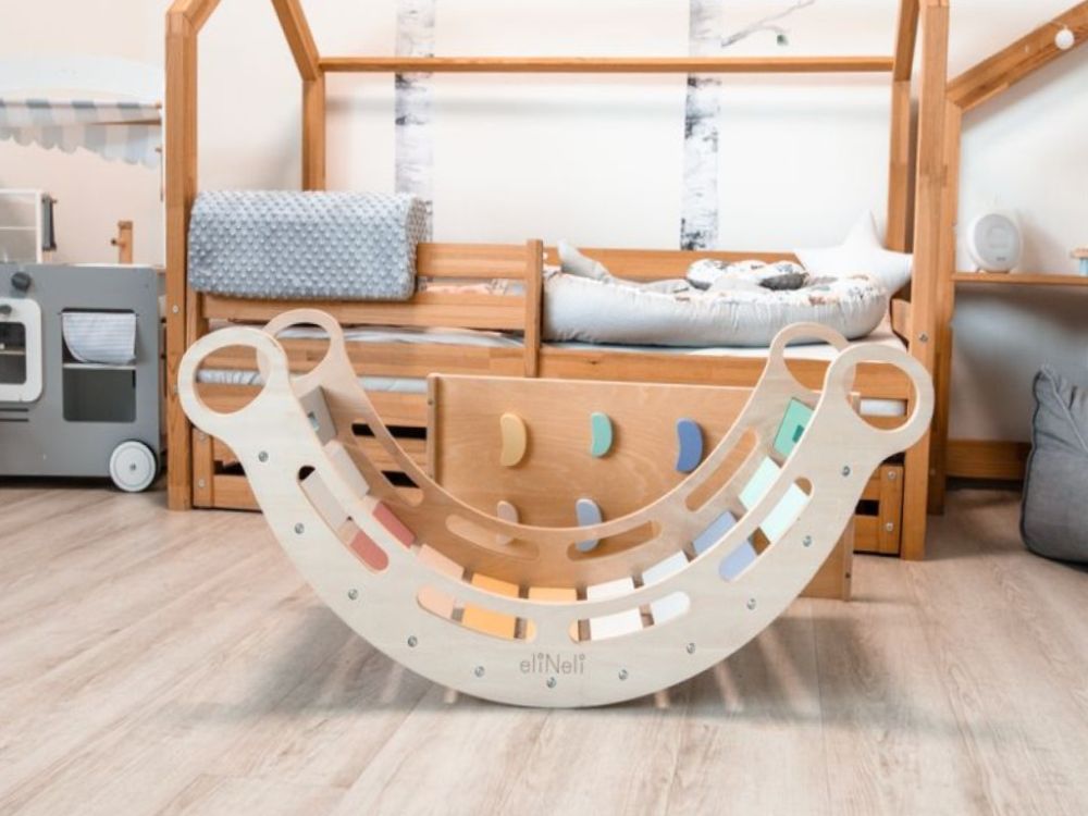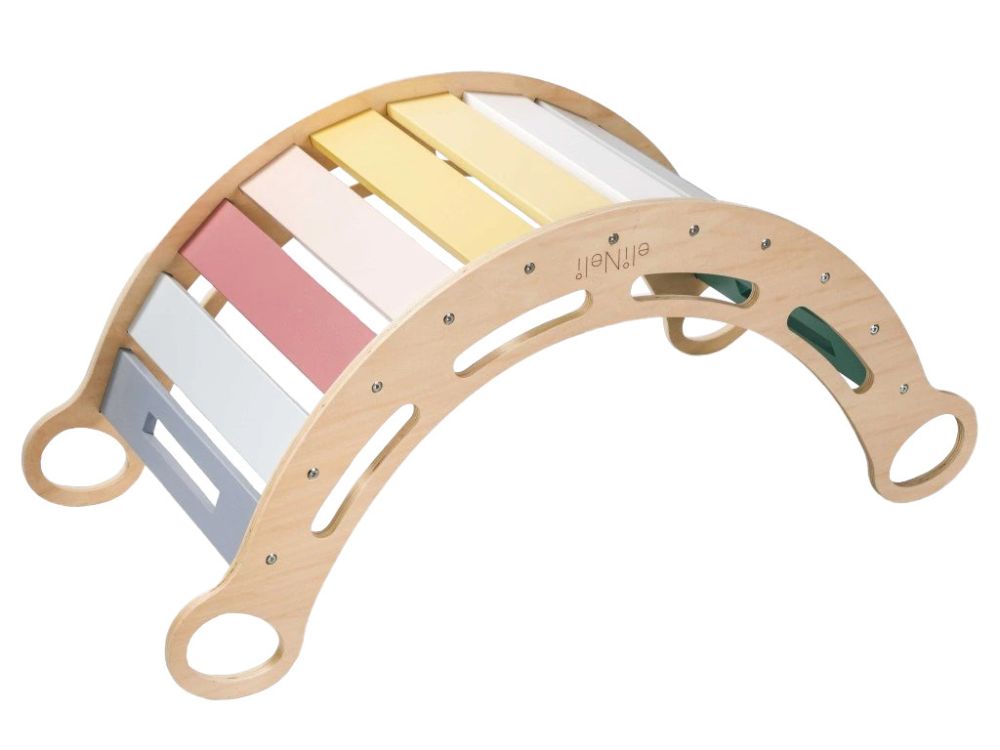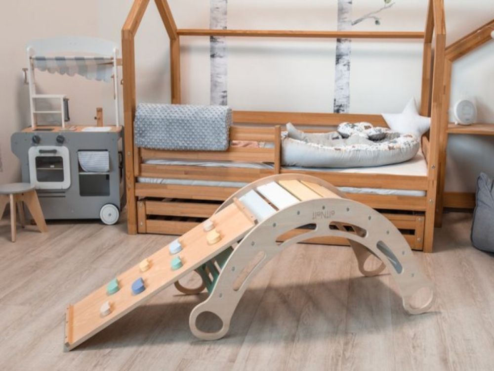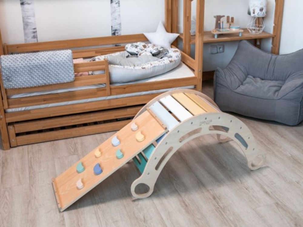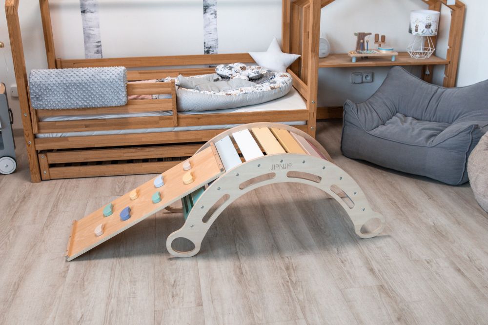 Das 5in1 Montessori-Kletterwippe-Set aus Holz mit 2in1 doppelseitigem Brett in einer Kombination aus Naturholz und sanften Pastellfarben ist ein multifunktionales Spielzeug für das Kinderzimmer, das den Kindern Spaß und eine natürliche Entwicklung bietet. Die Kletterwippe ermöglicht Schaukeln und sanftes Schaukeln zur Entspannung, Kinder können darüber klettern, darunter krabbeln, sich darunter verstecken, sich hinsetzen oder hinlegen. Das doppelseitige 2-in-1-Brett aus hochwertigem, transparent lackiertem Sperrholz dient auf der einen Seite als Rutsche und auf der anderen Seite als Kletterwand mit Griffen in sanften Pastellfarben, auf der Kinder rutschen, klettern und neue Bewegungsherausforderungen erobern können. Die Schaukel und das Brett können einzeln verwendet oder dank der Schienen an beiden Enden des Brettes miteinander verbunden werden. Sie können sie auch ganz einfach mit dem Pikler Dreiecke verbinden, um einen kleinen Spielplatz direkt in Ihrem Haus, im Zimmer Ihres Kindes, zu schaffen.