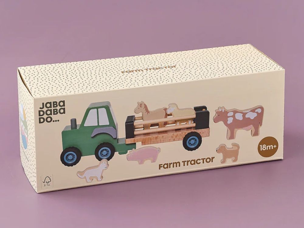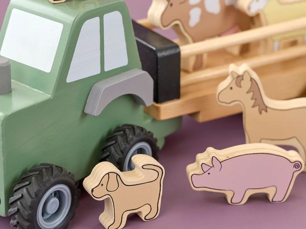 Das Holzauto in Form eines grünen Traktors mit einem Abstellgleis und 6 Holztieren ist ein Spielzeug, das jedes Kind lieben wird. Kinder können mit dem Traktor, dem Anhänger und den Tieren unabhängig voneinander spielen oder alles miteinander verbinden und einen echten Bauern spielen, der seine Tiere auf dem Anhänger transportiert. Muss man das Pferd, die Kuh, das Schaf oder das Schwein auf die Weide bringen, vom Zimmer ins Wohnzimmer, in die Küche oder einfach nur auf dem Bauernhof (im Zimmer) herumfahren? Jede Fahrt ist ein großer Spaß und ein großes Abenteuer.