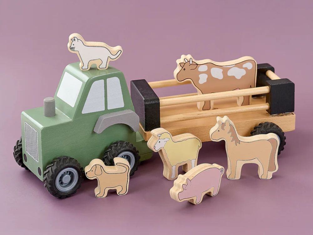 Der Holztraktor in Pastellgrün mit einem Abstellgleis für den Transport von Tieren, die Kinder von Bauernhöfen und Zoos kennen, ist bereit, ein Pferd, eine Kuh, ein Schaf, ein Schwein, eine Katze und einen Hund genau dorthin zu transportieren, wo Kinder mit Tieren und Holzautos spielen wollen. Holztiere sind im Lieferumfang enthalten.