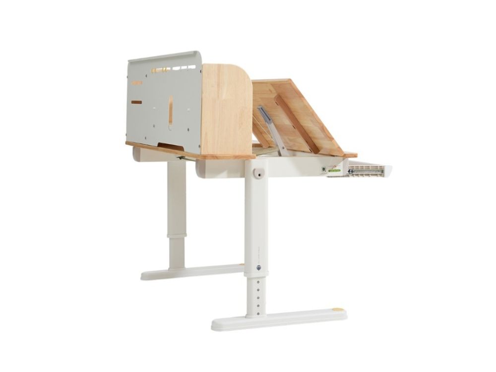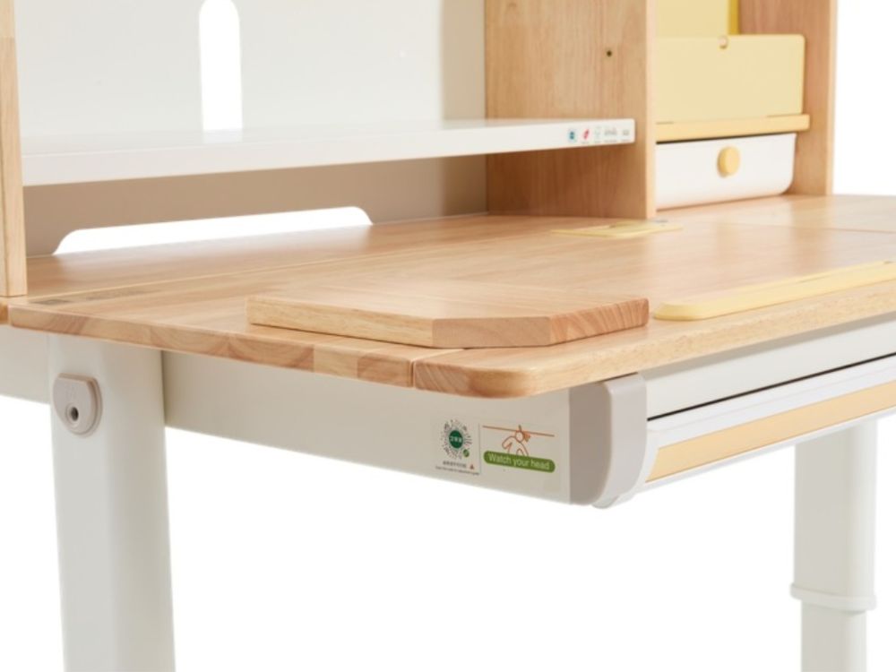 Ein hochwertiger Schreibtisch in ergonomischem Design gehört untrennbar in ein Kinderzimmer. Der Kinderschreibtisch in einer Kombination aus Naturholz mit weißer und gelber Farbe, mit Ablagen und Schubladen und einer großen Arbeitsfläche, ermöglicht es Kindern, mit maximalem Komfort und Bequemlichkeit zu zeichnen, zu schreiben, zu lernen und zu gestalten. Durch die Möglichkeit, die Höhe der Arbeitsfläche zu verstellen, wächst dieser Schreibtisch buchstäblich mit Ihrem Kind mit. Sie können die Höhe schnell und einfach manuell einstellen. Auf diese Weise können Kinder nicht nur am Tisch sitzen, sondern auch stehen. Außerdem ist ein Teil der Tischplatte klappbar, so dass z. B. das Zeichnen oder Lesen sehr bequem ist. Direkt unter der Tischplatte verbirgt sich eine große Schublade für Schul-, Schreib- oder Kunstmaterialien. Kinder werden die zusätzlichen Stauräume oberhalb der Tischplatte lieben - Regale und Schubladen. Sie laden direkt zum Ausstellen von Lieblingsbüchern, Familienfotos, Anhängern, Schätzen und allem anderen, was nicht in die Schubladen passt, ein. Hochwertige Materialien garantieren hohe Stabilität, Haltbarkeit und Langlebigkeit. Der Schreibtisch wird Ihr Kind durch die Kindheit, die Vorschule und die Zeit des Studiums in der Grund- und Mittelschule begleiten.