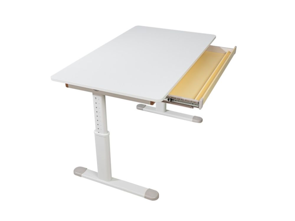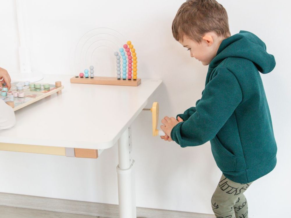 Ein hochwertiger und ergonomischer Schreibtisch ist ein wesentlicher Bestandteil des Kinderzimmers. Der Kinderschreibtisch im skandinavischen Stil mit seiner großen Arbeitsfläche ermöglicht es den Kindern, mit maximalem Komfort zu zeichnen, zu schreiben, zu lernen und zu gestalten. Durch die Möglichkeit, die Höhe der Arbeitsfläche zu verstellen, wächst dieser Schreibtisch buchstäblich mit Ihrem Kind mit. Sie können die Höhe von 52 bis 76 cm verstellen, einfach mit der Hand. Auf diese Weise können Kinder nicht nur am Tisch sitzen, sondern auch stehen. Direkt unter der Tischplatte befindet sich eine praktische große Schublade für Schul-, Schreib- oder Malutensilien. Hochwertige Materialien garantieren eine hohe Stabilität, Langlebigkeit, Belastbarkeit und Langlebigkeit. Der Schreibtisch begleitet Ihr Kind durch die Kindheit, die Vorschulzeit und die Zeit des Studiums in der Grundschule und weiterführenden Schule. Der Schreibtisch ist mit einem praktischen Haken zum Aufhängen einer Aktentasche oder eines Rucksacks ausgestattet.